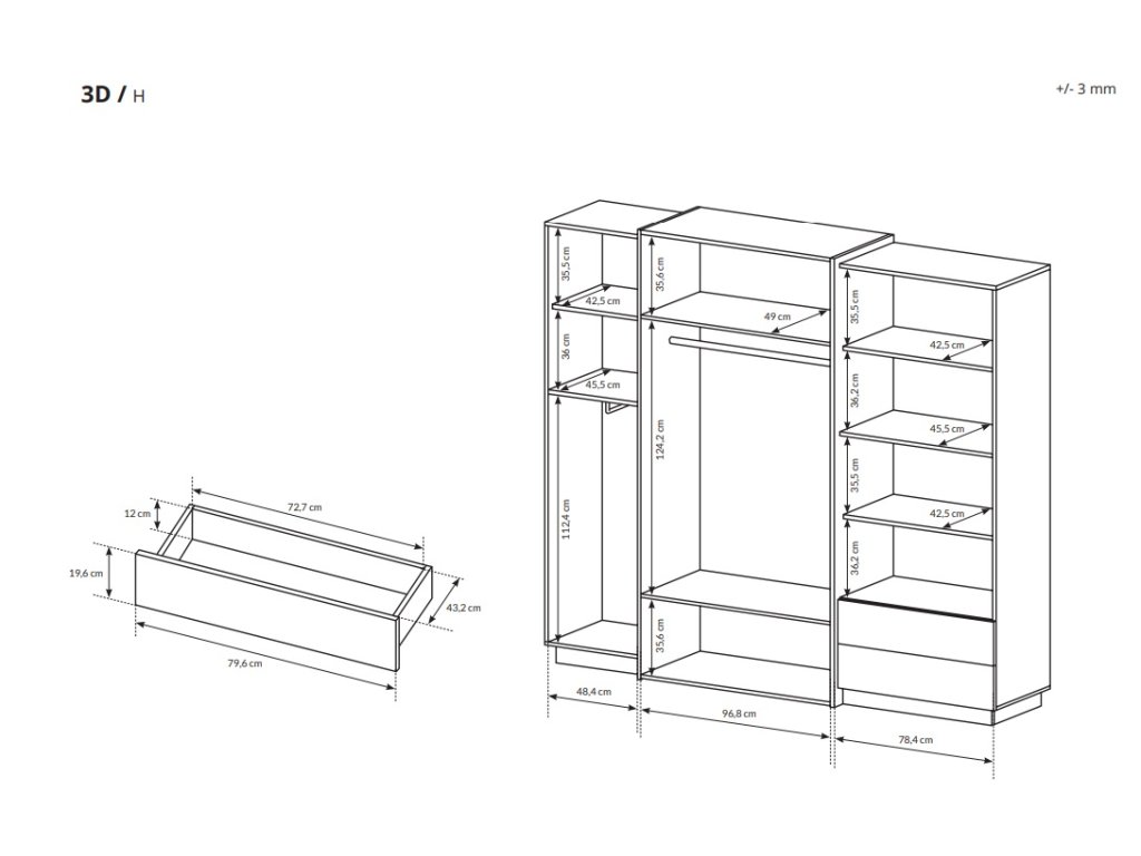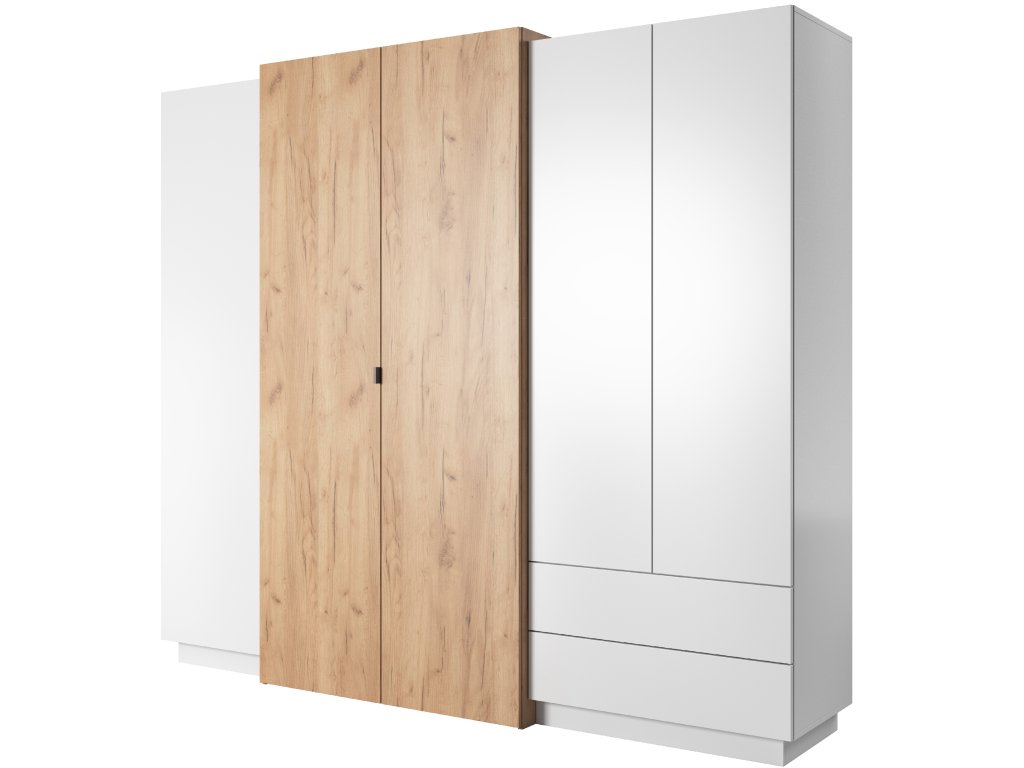 Vnitřní uspořádání je rozděleno do tří sektorů: levá strana obsahuje dvě police a výsuvnou věšákovou tyč, střední část nabízí horní a spodní polici, mezi kterými je věšáková tyč – navíc je na vnitřních dveřích – navíc je na vnitřních dveřích – navíc je na vnitřních dveřích. Pravá strana je řešena jako policová část s množstvím odkládacích míst na třičtvrtě výšky a doplněna o dvě prostorné zásuvky ve spodní části. Díky systému push-to-open působí skříň minimalisticky a čistě, bez viditelných úchytek.