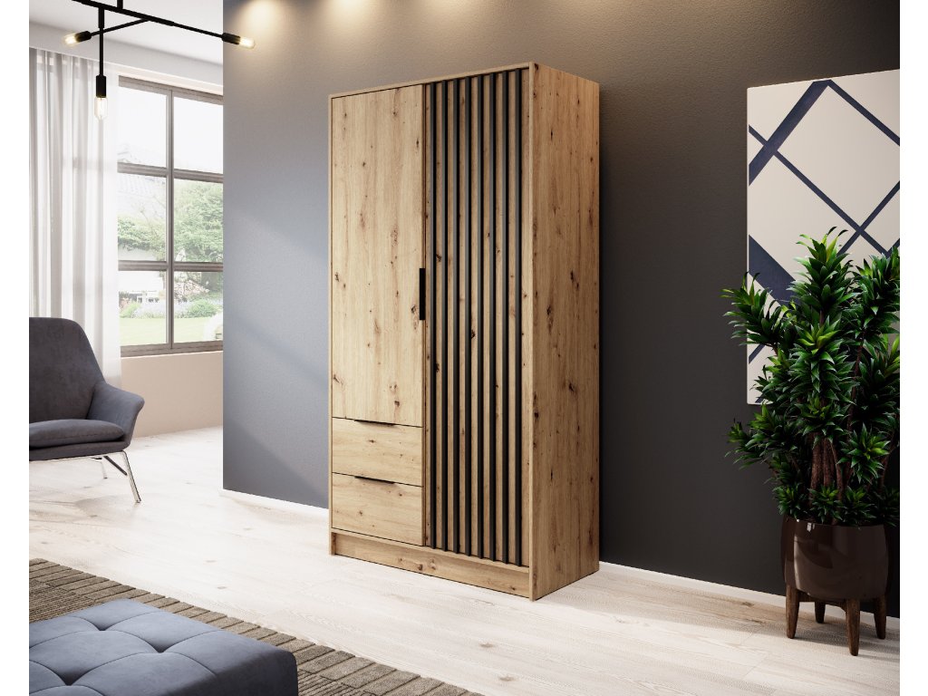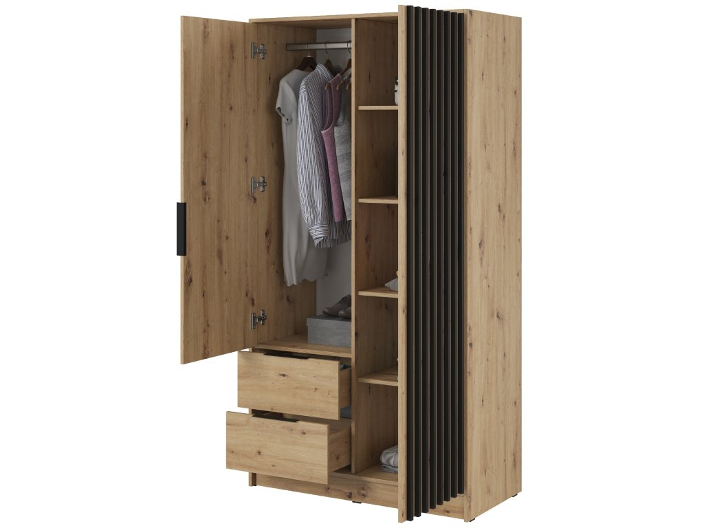 Šatní skříň Nelly 2D v oblíbené kombinaci přírodního dekoru dub artisan a kontrastních černých lamel je praktickým řešením pro menší ložnice, chodby či pokoje pro hosty. Vnitřek skříně nabízí široký prostor s věšákovou tyčí pro zavěšení oblečení a boční úložný prostor se čtyřmi pevnými policemi. Tato kompozice umožňuje ideální rozdělení na zavěšené i poskládané kousky oblečení. Vizuální skříň doplňují lamely, které zdobí přední plochu a spolu s černými plastovými úchyty podtrhují její výrazně moderní charakter. Vyrobena je z laminované desky s ABS hranami, která zaručuje trvanlivost i estetický dojem.