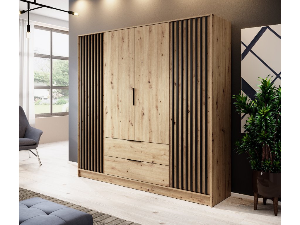 Šatní skříň Nelly 4D v kombinaci dekoru dub artisan a černých ozdobných lamel je skvělou volbou pro milovníky přírodního vzhledu s moderním akcentem. Střední část skříně nabízí široký prostor s věšákovou tyčí, pod kterou se nacházejí dvě prostorné zásuvky vhodné na prádlo či doplňky. Boční části skříně ukrývají po čtyř policích, které jsou ideální pro složené oblečení, doplňky nebo úložné boxy. Design skříně dotváří vertikálně frézované lamely s profilem 18 × 18 mm, černé plastové úchyty a kvalitní zpracování z laminované desky s ABS hranami, které zaručují dlouhodobou odolnost a stabilitu.