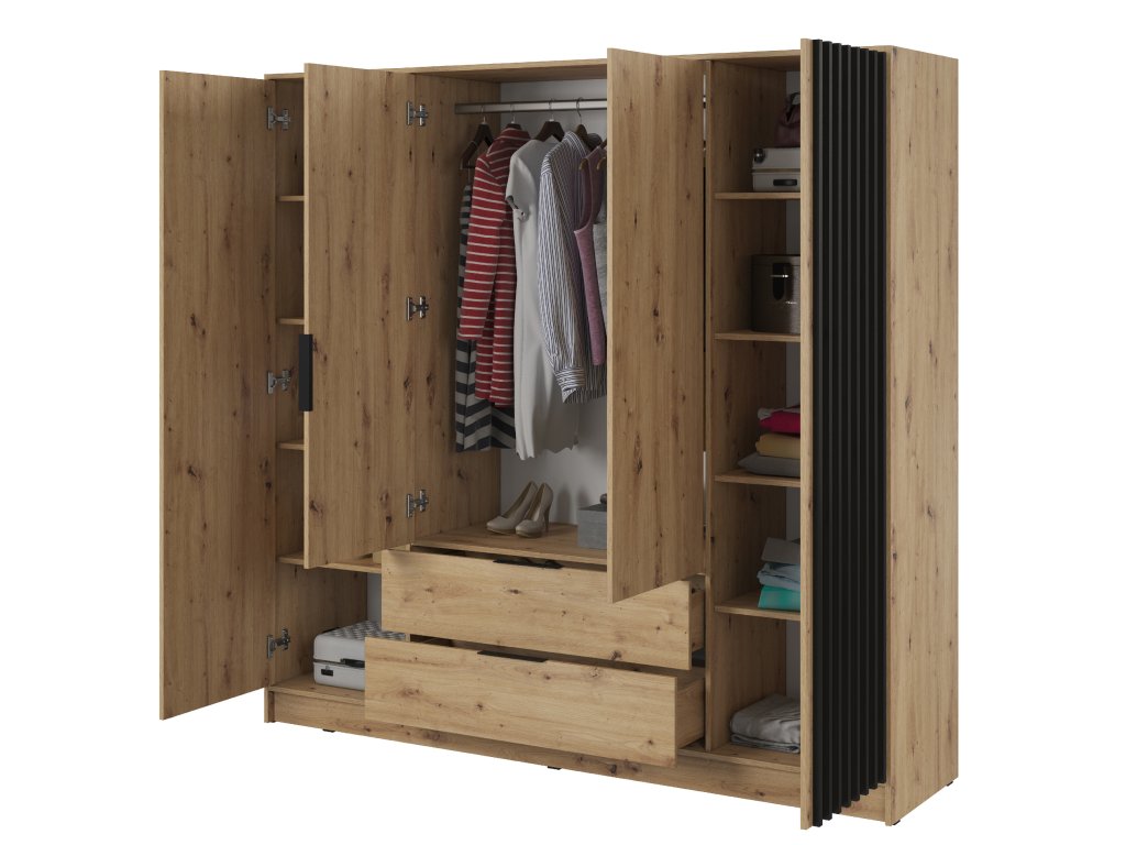 Šatní skříň Nelly 4D kombinuje prostor s ramínkovou tyčí, dvě zásuvky a čtyři police na obou stranách. Díky spojení přírodního dekoru dub artisan s černými lamelami působí moderně, ale zároveň teplo. Poskytuje přehledný a funkční úložný prostor pro každodenní potřeby. Skvělá volba do stylové ložnice či šatníku.