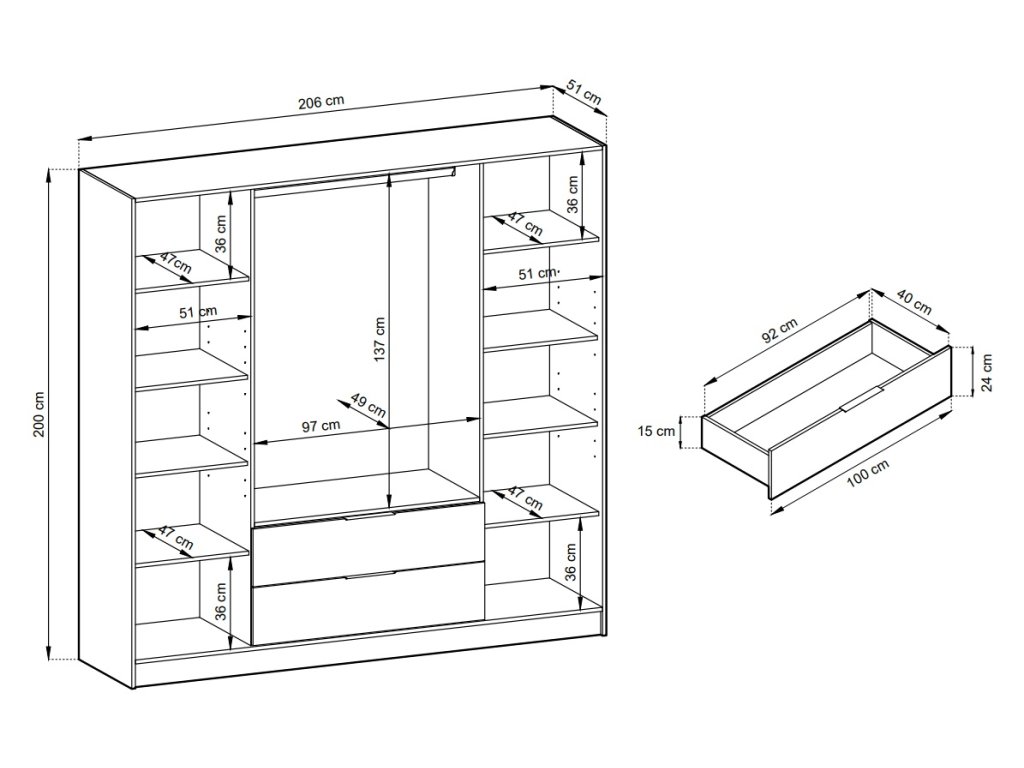 Komody i skříně jsou vyrobeny z laminované desky (16 mm) s ABS hranami a vybaveny praktickými úchyty z černého plastu. Vnitřní systém polic je uzpůsoben pro maximální flexibilitu: nastavitelné police (nosnost 3 kg), pevné police (5 kg), zásuvky o nosnosti 2–3 kg podle typu. Díky široké nabídce kolekce Nelly, rozměrů jednotlivých prvků a nástaveb si můžete vyskládat ideální sestavu přesně pro váš prostor.