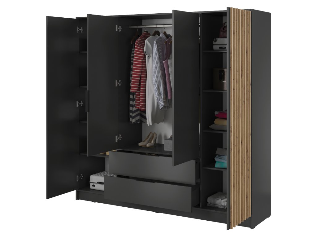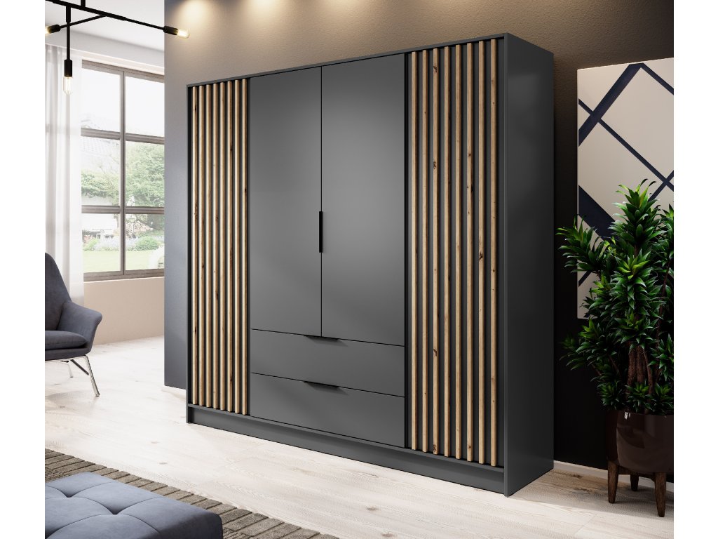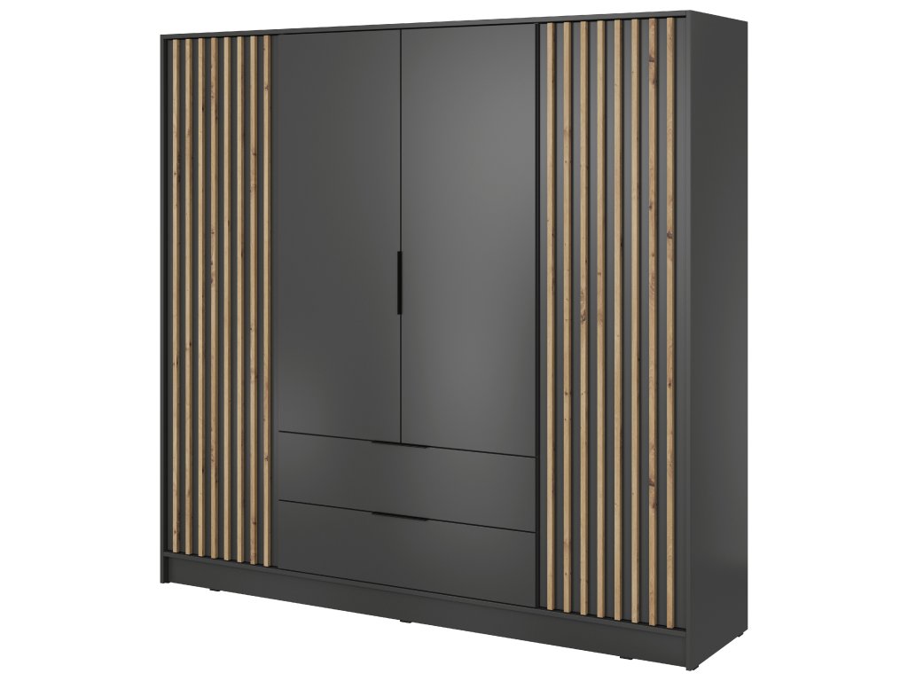Čtyřdveřová skříň Nelly 4D v kombinaci grafitového korpusu a lamel v dekoru dub artisan spojuje elegantní vzhled s vysokou funkčností. Střední část skříně nabízí široký prostor s věšákovou tyčí pro zavěšení oblečení, pod kterým jsou umístěny dvě prostorné zásuvky ideální pro prádlo, doplňky nebo sezónní kousky. Boční dvířka ukrývají po čtyřech pevných policích, které zajišťují dostatek místa pro přehledné uložení oblečení nebo textilu. Přední plochy jsou zvýrazněny vertikálními lamelami s profilem 18 × 18 mm, které spolu s černými plastovými úchyty a kvalitní laminovanou deskou s ABS hranami vytvářejí čistý a moderní dojem.
