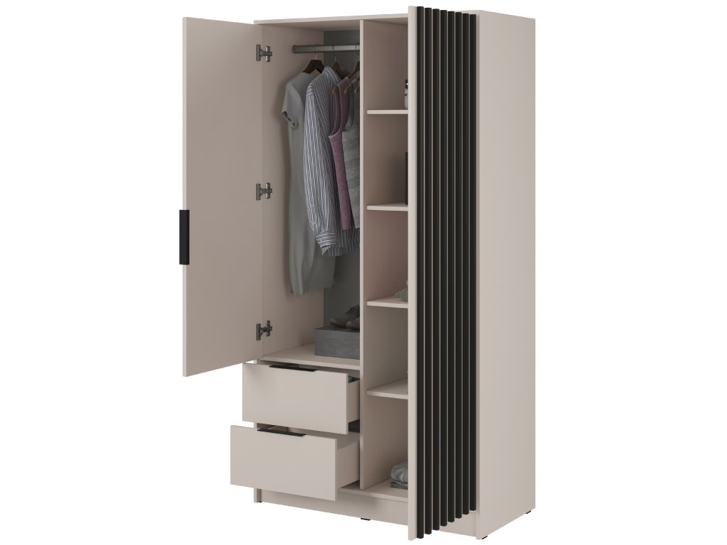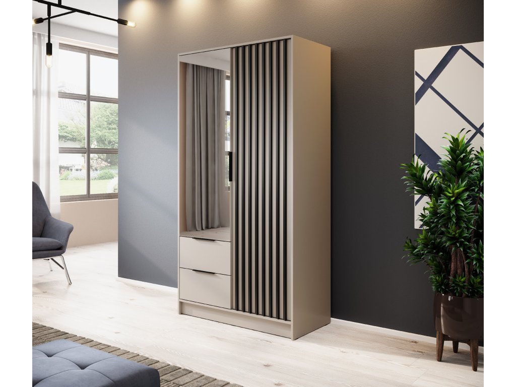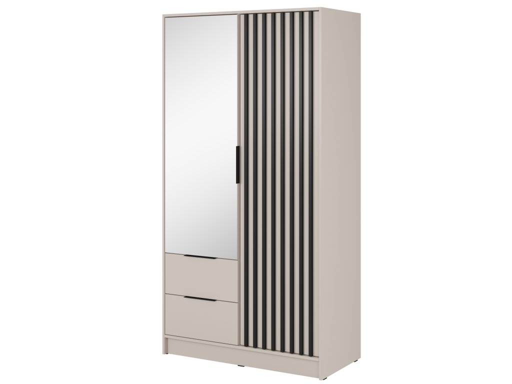 Dvoudveřová skříň Nelly 2D v provedení béžová (kašmírová) s kontrastními černými lamelami je elegantním a kompaktním řešením do menších místností, které potřebují stylový a přehledně členěný úložný prostor. Přední zrcadlová dvířka nejenže opticky zvětšují prostor, ale zároveň slouží jako praktický doplněk při oblékání. Za nimi se nachází kombinace věšákové tyče na zavěšené oblečení a čtyř pevných polic na straně, kde si pohodlně uložíte složené kousky, doplňky nebo boxy. Skříň je vyrobena z kvalitní laminované desky s ABS hranami, doplněna o černé plastové úchytky a zvýrazněna dekorativními frézovanými lamelami, které jí dodávají moderní a charakteristický vzhled.