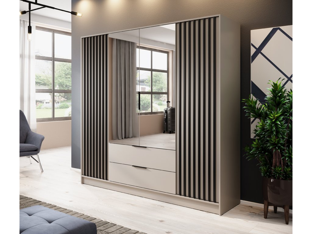 Skříň Nelly 4D nabízí dvě zrcadlová dvířka se širokou věšákovou tyčí (bez horní police), pod kterými jsou dvě prostorné zásuvky. Boční dvířka ukrývají čtyři pevné police na každé straně. Spojení béžového korpusu s černými lamelami vytváří moderní, elegantní vzhled. Ideální řešení pro ty, kteří chtějí styl i pořádek na jednom místě.