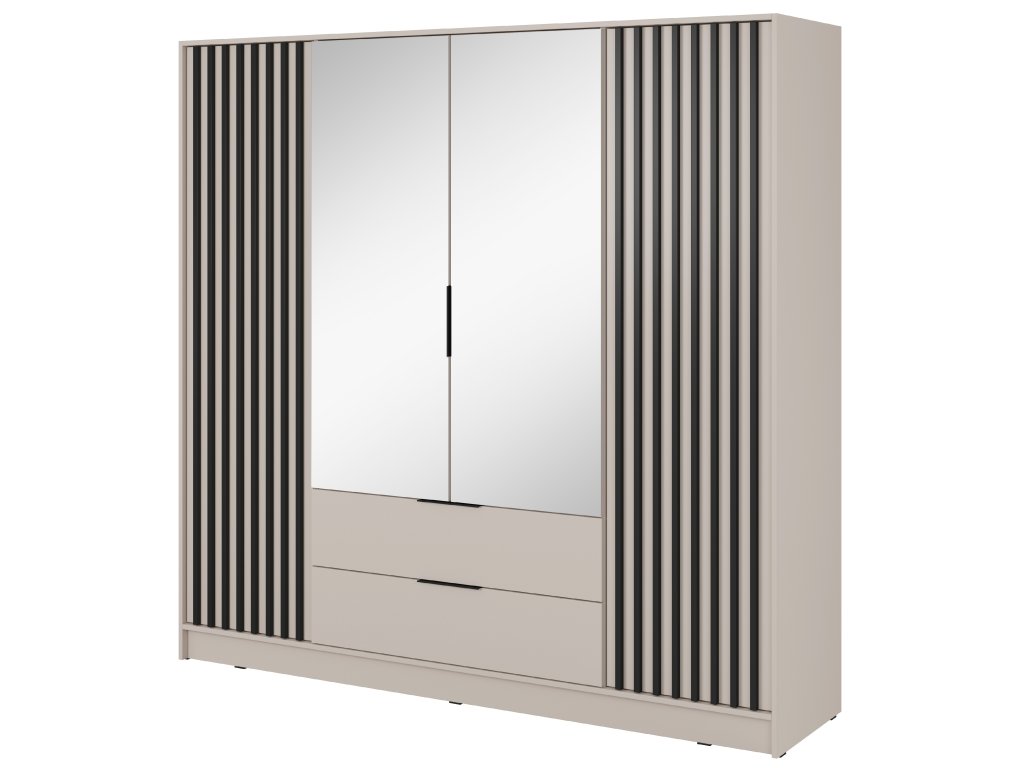 Šatní skříň Nelly 4D v kombinaci jemné béžové (kašmírové) barvy a výrazných černých lamel je navržena tak, aby poskytla velkorysý úložný prostor a zároveň dotvořila interiér s citem pro moderní kontra. Střední dvoje zrcadlová dvířka ukrývají široký prostor s věšákovou tyčí, ideální pro bundy, šaty nebo kabáty. Pod tyčí se nacházejí dvě širší zásuvky, které jsou jako stvořené na prádlo či doplňky. Boční části skříně disponují čtyřmi policemi po celé výšce, díky čemuž získáte přehledné a oddělené úložné zóny. Skříň je vyrobena z laminované desky s ABS hranami, doplněna o černé plastové úchyty a elegantní lamely s profilem 18 × 18 mm.