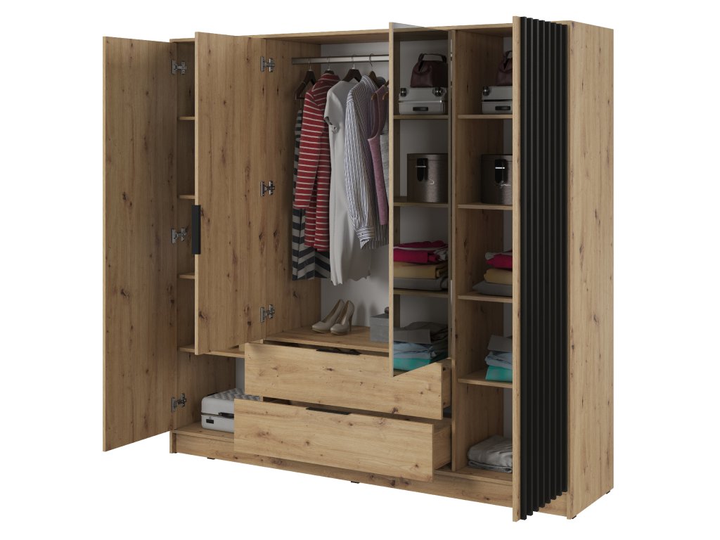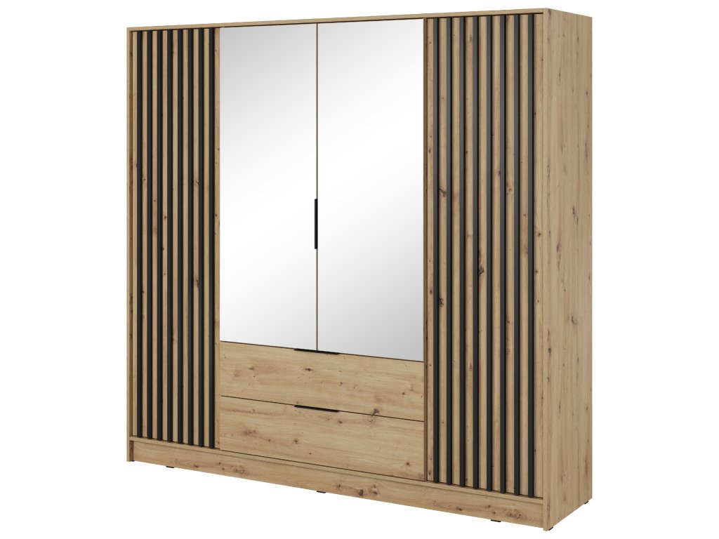 Šatní skříň Nelly 4D v trendové kombinaci teplého dekoru dub artisan a výrazných černých lamel přináší do interiéru přirozený vzhled s moderním nádechem. Ve střední části skříně se nacházejí dvě zrcadlová dvířka, za kterými je umístěna široká věšáková tyč bez horní police – ideální pro zavěšení šatů, kabátů či košil. Pod ní najdete dvě prostorné zásuvky, které poskytují místo pro spodní prádlo, doplňky nebo oblíbené kousky. Boční sekce skříně, ukryté za plnými dvířky, obsahují po čtyřech pevně umístěných policích, díky čemuž získáte spoustu prostoru pro přehledné uložení oblečení či textilu. Skříň je vyrobena z laminované desky s ABS hranami, doplněna o černé plastové úchyty a ozdobné lamely s profilem 18 × 18 mm, které vytvářejí elegantní rytmus na předních plochách.