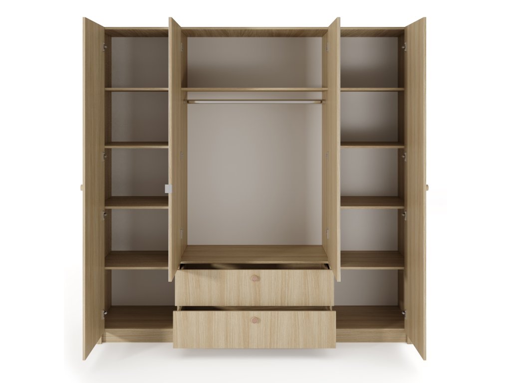 Šatní skříň Viki A je elegantní a praktický kousek do ložnice, který nabízí bohatý úložný prostor v teplém dřevěném dekoru dub barista. Skříň má čtyř dveří, přičemž dvě středové jsou vybaveny velkým zrcadlem, které opticky rozjasňuje a zvětšuje místnost. Pod nimi se nacházejí dvě širší zásuvky, ideální pro uskladnění drobností, prádla nebo doplňků. Vnitřní členění je navrženo s důrazem na funkčnost – střední část obsahuje věšákovou tyč s horní policí, zatímco levá i pravá strana nabízejí čtyři pevné police. Dřevěné nožičky a úchyty s aplikací v odstínu moka dotváří útulný a přírodně laděný vzhled.