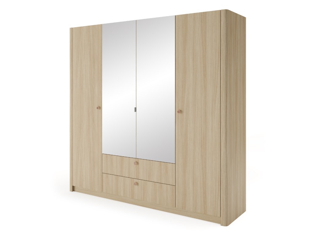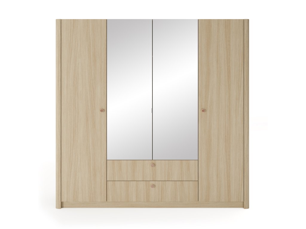Čtyřdveřová šatní skříň Viki A nabízí zrcadlové středové dveře, dvě prostorné zásuvky, věšákovou tyč s policí a 8 bočních polic. Teplý dekor dub barista doplňují dřevěné úchyty s moka aplikací a zaoblené detaily. Skříň poskytuje spoustu prostoru a zároveň působí harmonicky. Skvělý doplněk do útulné a přirozeně laděné ložnice.
