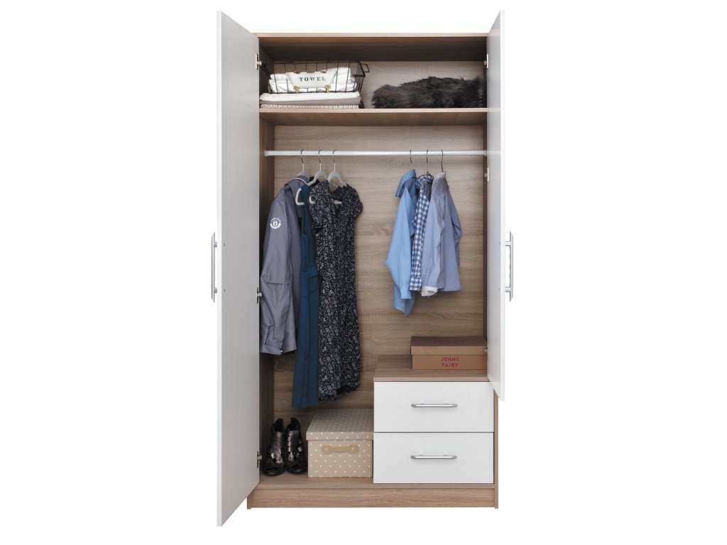 Moderní šatní skříň Smart SR3 bez zrcadla v trendovém provedení dub sonoma - bílá. K přehlednějšímu uložení oblečení a oděvních doplňků přispěje police, zásuvky a prostor se závěsnou tyčí. Skříň je vhodná nejen do šatníků, ale také do ložnic nebo pokojů. Prozkoumejte další prvky šatní kolekce Smart.