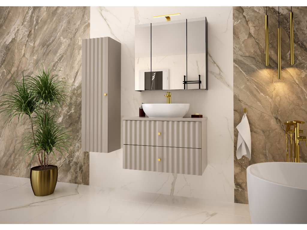 Koupelnová skříňka Aqua 01 v matné béžové barvě s šířkou 80 cm kombinuje jemnou estetiku a praktičnost. Má dvě zásuvky a je dostupná ve variantách: bez vrchní desky, s vrchní deskou, s umyvadlem na desku nebo se zápustným umyvadlem. Vlnovitý profil dvířek, zlaté úchyty ve tvaru kuliček a závěsný design z ní dělají dokonalý doplněk pro moderní a elegantní koupelny.
