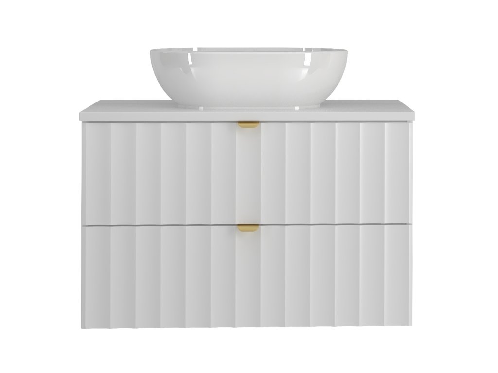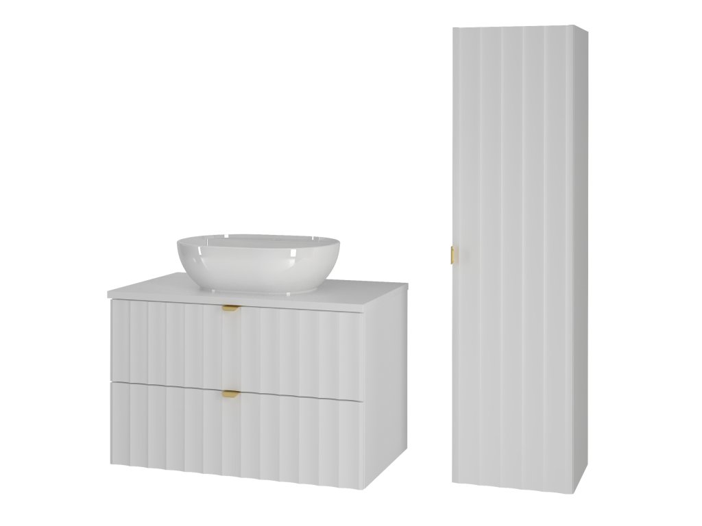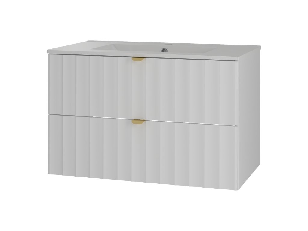 Koupelnová skříňka Arkos 07 v matné bílé barvě o šířce 80 cm a dvěmi zásuvkami nabízí praktické a elegantní řešení pro moderní koupelny. Dostupná ve čtyřech variantách: bez desky, s vrchní deskou, s umyvadlem na desku nebo se zápustným umyvadlem, přizpůsobí se vašim potřebám. Profil vtlačených vln a zlaté kovové úchyty dodávají luxusní vzhled, zatímco závěsné provedení zajišťuje vzdušnost a čisté linie prostoru.