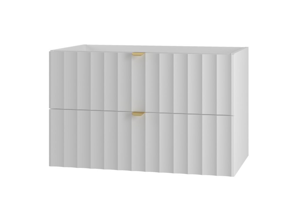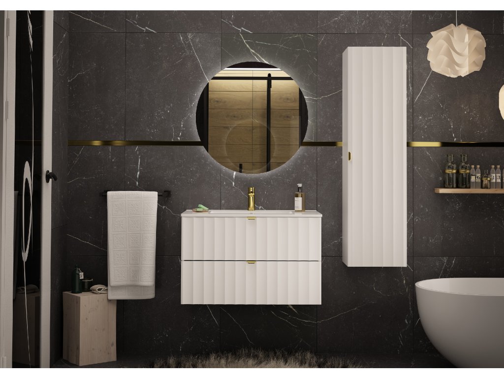 Čela zásuvek zdobí profil vtlačených vln, který přináší jemnou texturu, zatímco zlaté kovové úchytky přidávají eleganci a luxus. Závěsné provedení podtrhuje moderní a vzdušný vzhled koupelny. Kolekce Arkos je vyrobena z kvalitních materiálů – laminované DTD (16 mm) a fóliované MDF (18 mm) – které jsou odolné ve vlhkém prostředí. Skříňky disponují tichým dovíráním a zásuvkami s polovýsuvy, což zaručuje komfort při každodenním používání.