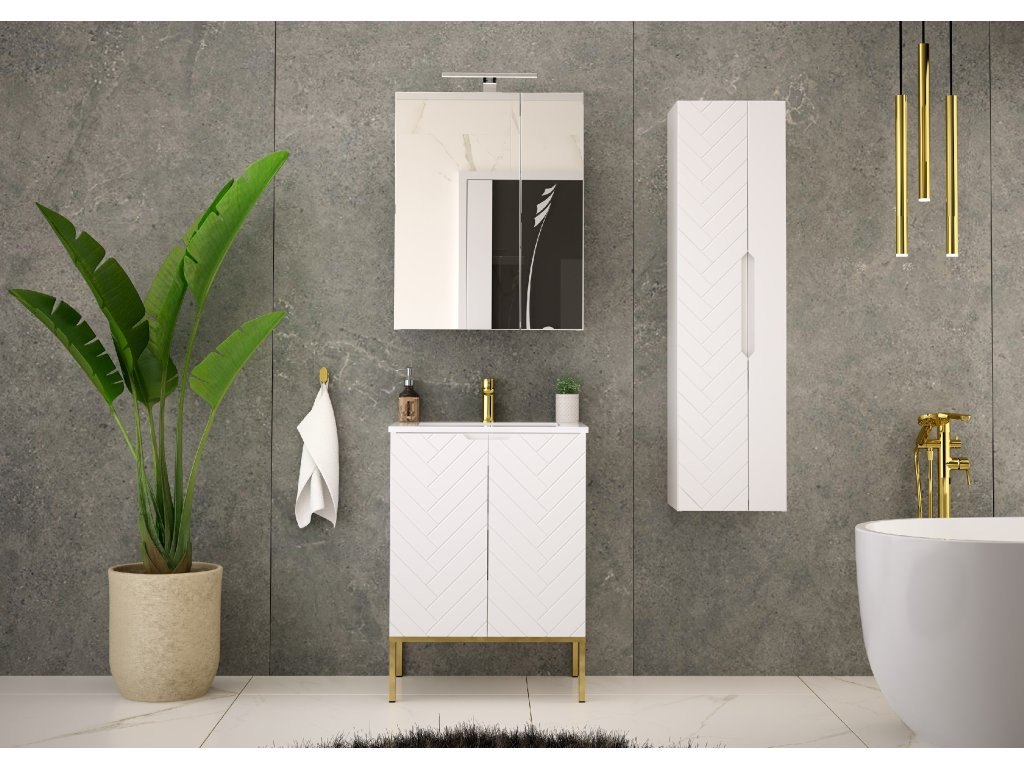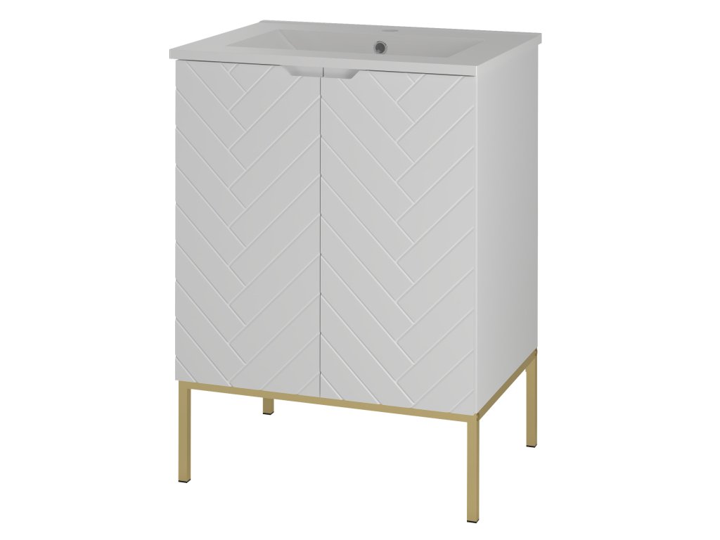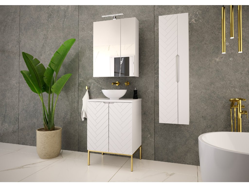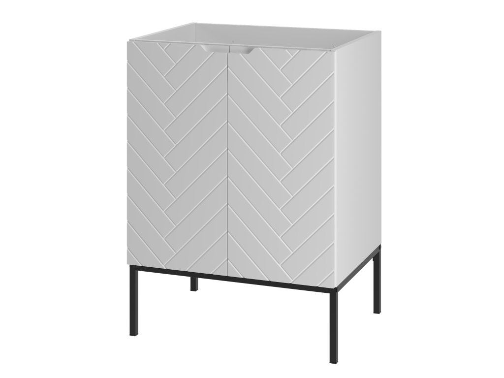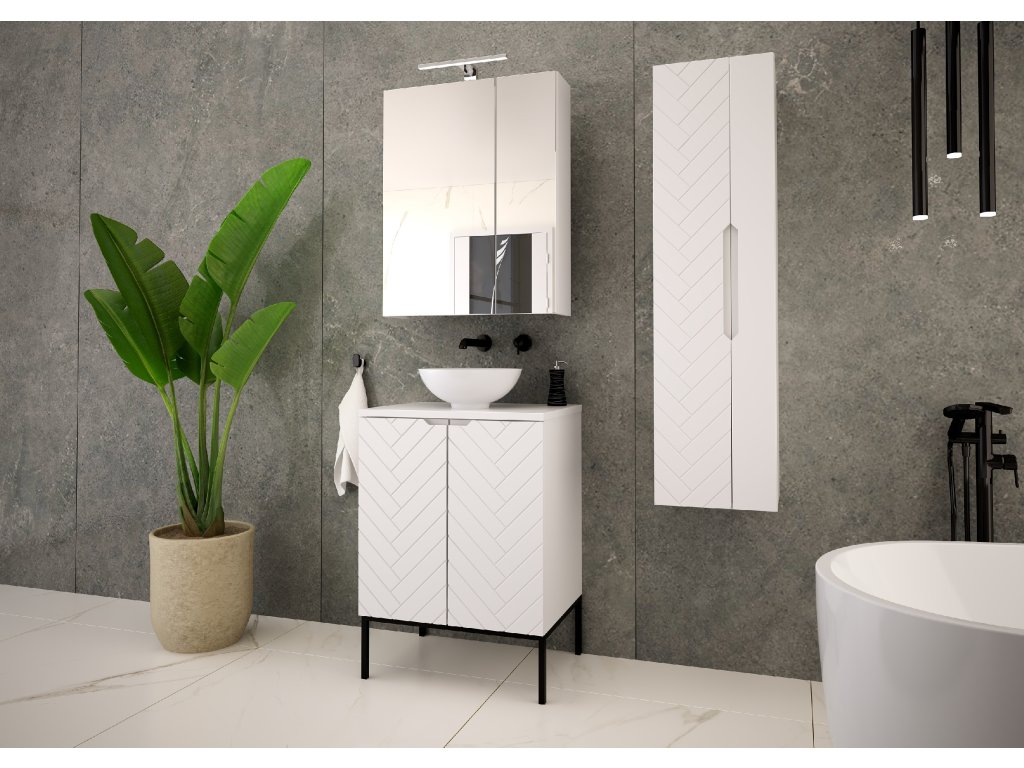 Koupelnová skříňka Aspen 09 v matné bílé barvě o šířce 60 cm je dostupná ve čtyřech variantách: bez vrchní desky, s vrchní deskou, s umyvadlem na desce nebo se zápustným umyvadlem. Frézovaná čela se stromečkovým vzorem a bezúchytkový design dodávají koupelně moderní minimalismus. Tato kompaktní skříňka je ideálním řešením pro menší prostory, které vyžadují praktická a estetická řešení.