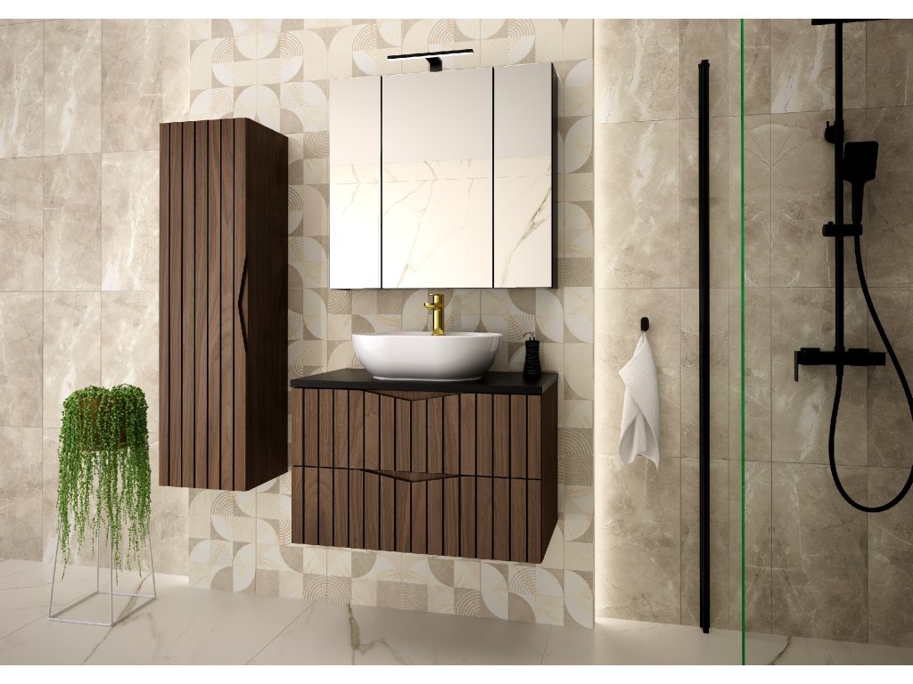 Představujeme vám koupelnovou skříňku pod umyvadlo Stesy 01, která spojuje moderní design s promyšlenou funkčností. Tato 80 cm široká skříňka je vyrobena z kvalitního laminovaného DTD korpusu a fóliovaného MDF pro fronty v elegantní ořechové barvě. Design doplňují ozdobné zářezy a zafrézované úchyty, které dodávají kousku luxusní vzhled.