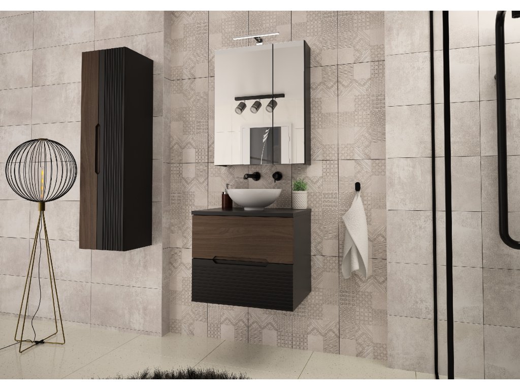 Koupelnová skříňka Avela 02 z kolekce Avela se šířkou 60 cm je stylovým a funkčním řešením pro moderní koupelny. Horní zásuvka v ořechovém dekoru přináší do prostoru přírodní nádech, zatímco spodní zásuvka v matné černé barvě s vodorovnými zářezy vytváří elegantní kontrast. Skříňka je navržena bez úchytek, otevírání je zajištěno prostřednictvím jemných zářezů, které podporují čisté linie designu.