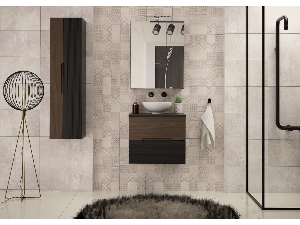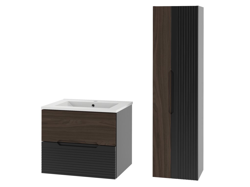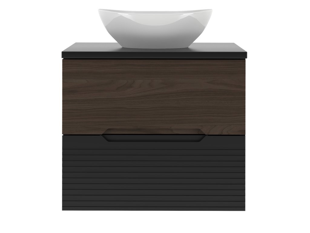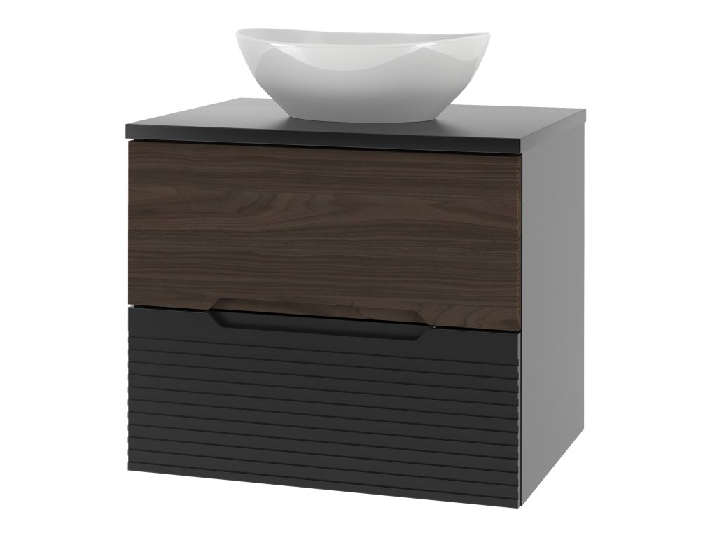 Koupelnová skříňka Avela 02 s šířkou 60 cm je elegantním spojením ořechového dekoru na horním zásuvce a černého povrchu se vodorovnými zářezy na spodním zásuvce. Navržená bez úchytek, skříňka nabízí minimalistický a čistý design, dostupný v čtyř variantách bez desky, s deskou, s umyvadlem na desku nebo zápustným umyvadlem. Ideální volba pro moderní a funkční koupelny.