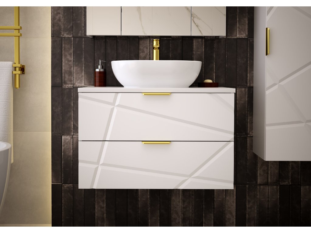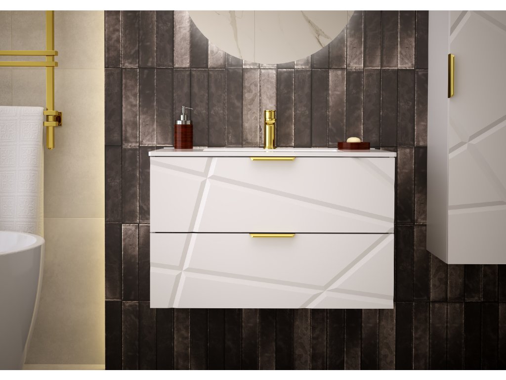 Elegantní bílá matná koupelnová skříňka s umyvadlem Radan 06 ze stejnojmenné kolekce, o šířce 80 cm, dostupná ve čtyřech variantách. Nepravidelné zářezy na frontách a zlaté kovové úchyty dodávají jedinečný design. Má dvě zásuvky s částečným výsuvem a tichým dovíráním, které poskytují praktické úložné řešení.