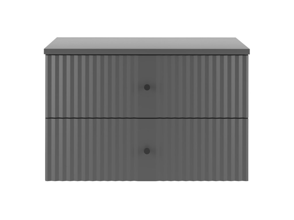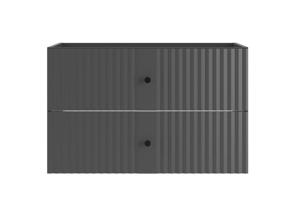 Elegantní řešení v sofistikovaném odstínu antracit, koupelnová skříňka s umyvadlem Xilo 01 je dostupná v čtyř verzích: s deskou, bez desky, se zápustným umyvadlem a s umyvadlem na desku. Její jedinečný design s výraznými frontami se zářezy a kulatými černými úchyty spojuje moderní vzhled s kvalitními materiály (fóliovaná MDF a laminovaná DTD) pro maximální odolnost. Praktické funkce, jako tiché dovírání a částečný výsuv zásuvek, zajišťují komfortní a bezproblémové používání každý den.