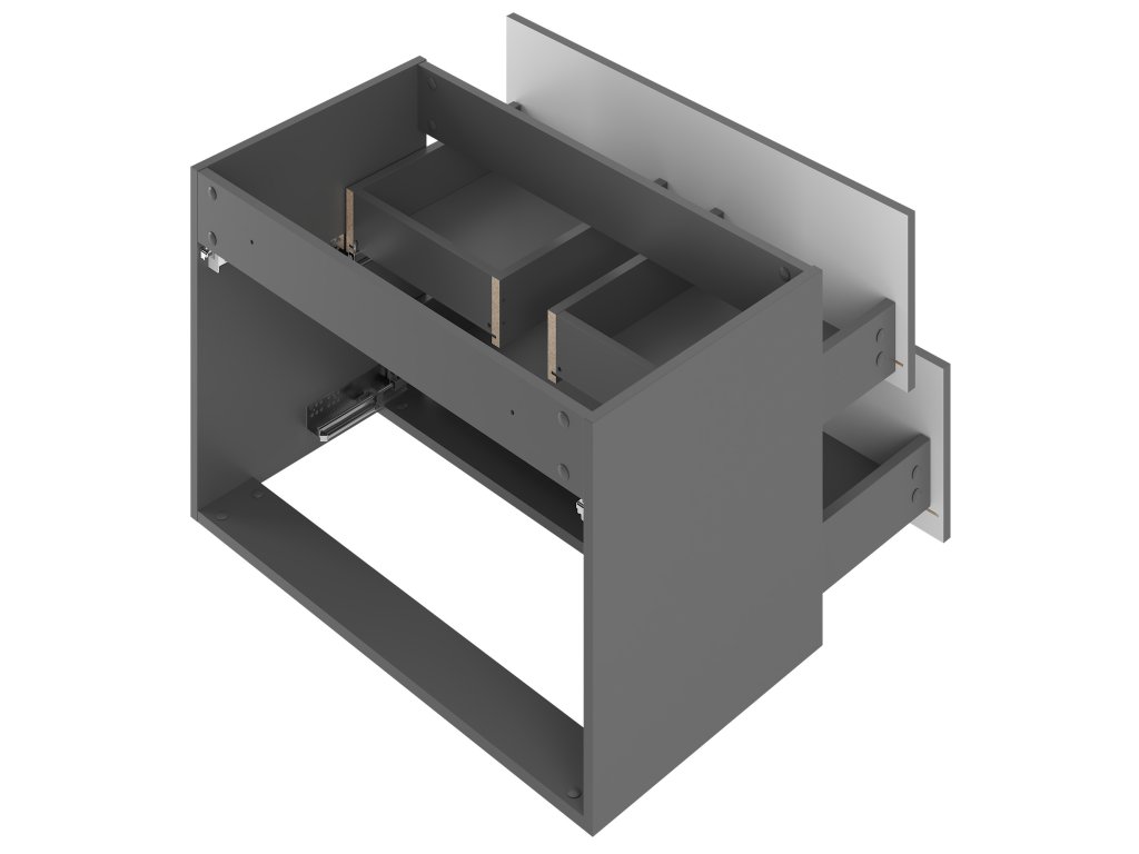 Korpus je vyroben z laminované DTD, který odolává vlhkosti a zajišťuje snadnou údržbu. Povrchová úprava fóliované MDF zaručuje estetický vzhled a trvanlivost, přičemž odolává dennímu opotřebení.
