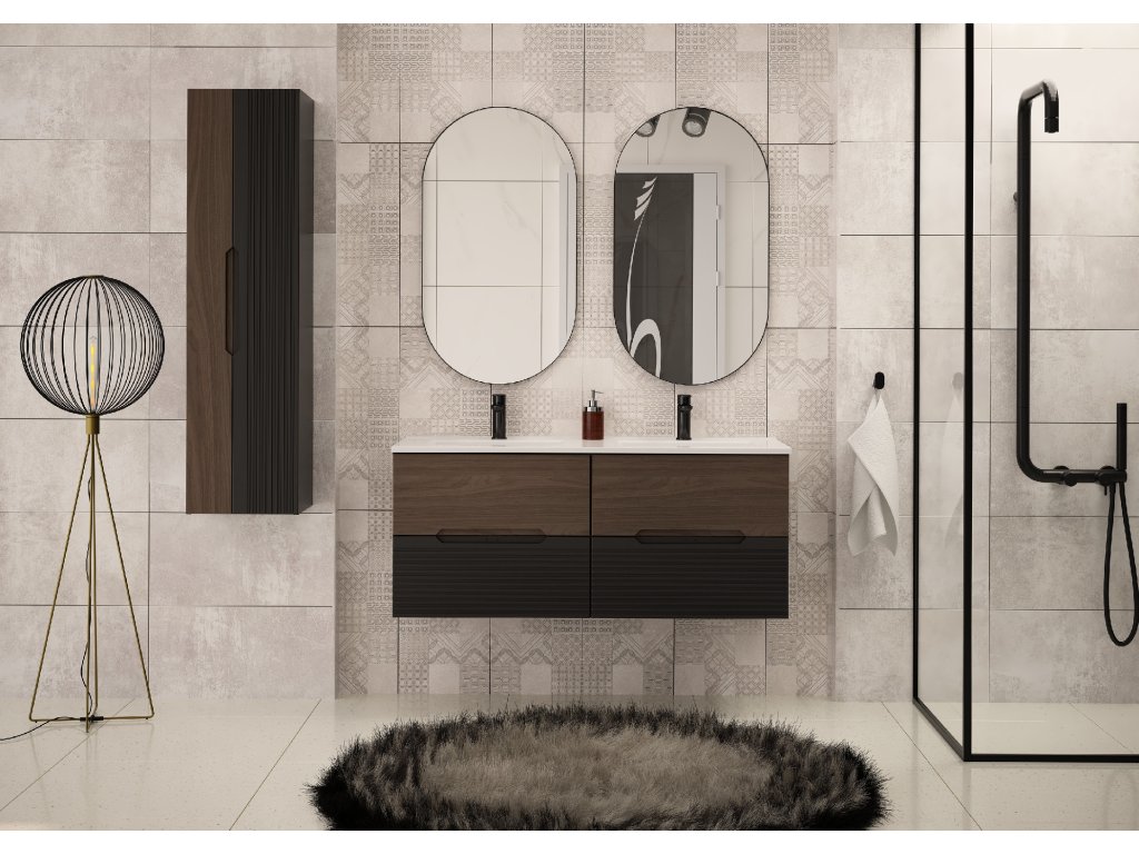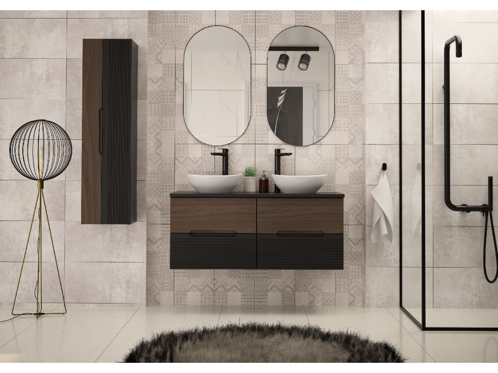 Široká skříňka Avela 02 120 spojuje ořechový dekor na horních zásuvkách s matnou černou a vodorovnými zářezy na spodních zásuvkách. S šířkou 120 cm a čtyři zásuvkami je dostupná v třech variantách – s vrchní deskou, s umyvadly na desku nebo se zápustným umyvadlem. Elegantní kombinace černé a ořechu s důrazem na čistý design činí z této skříňky ideální doplněk pro každou moderní koupelnu.