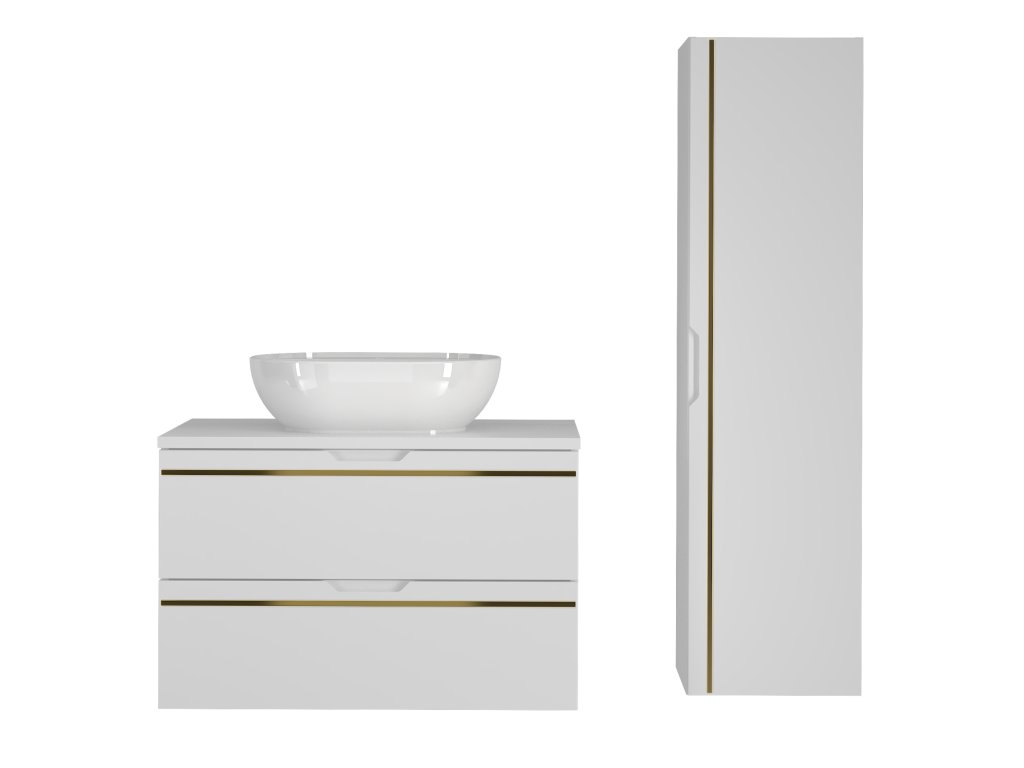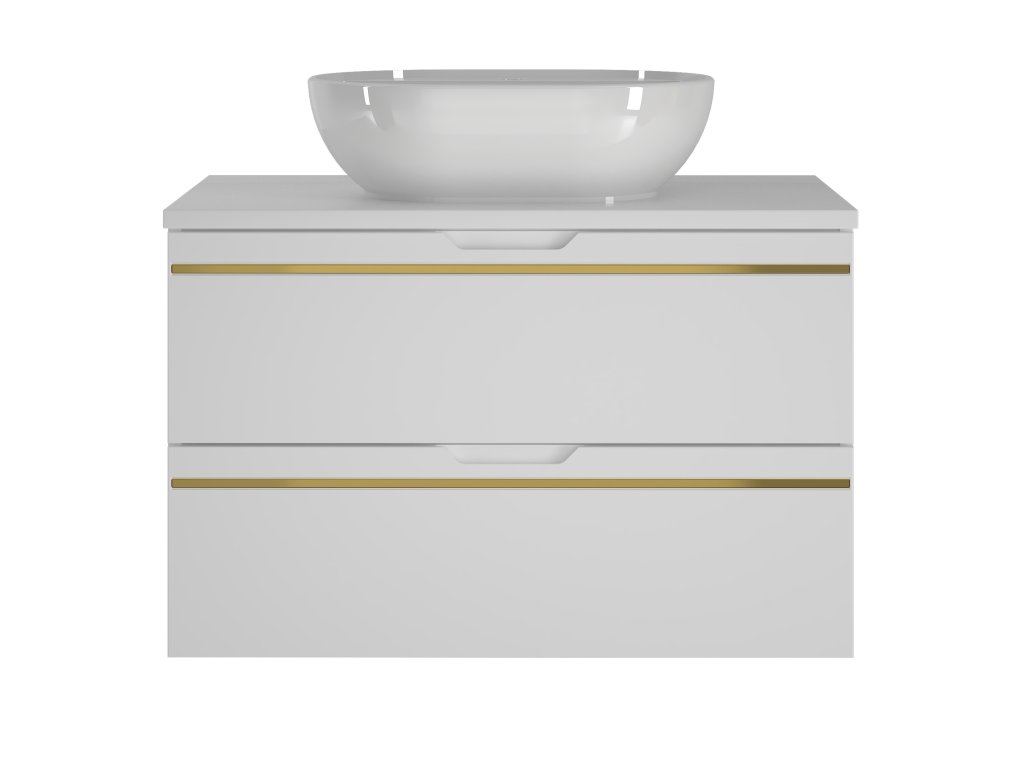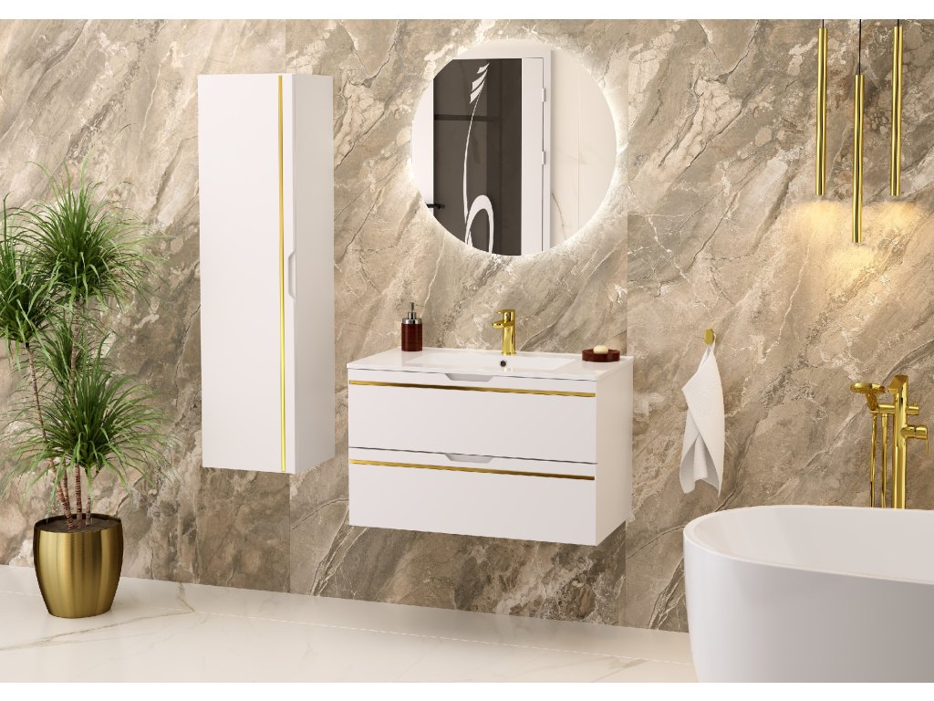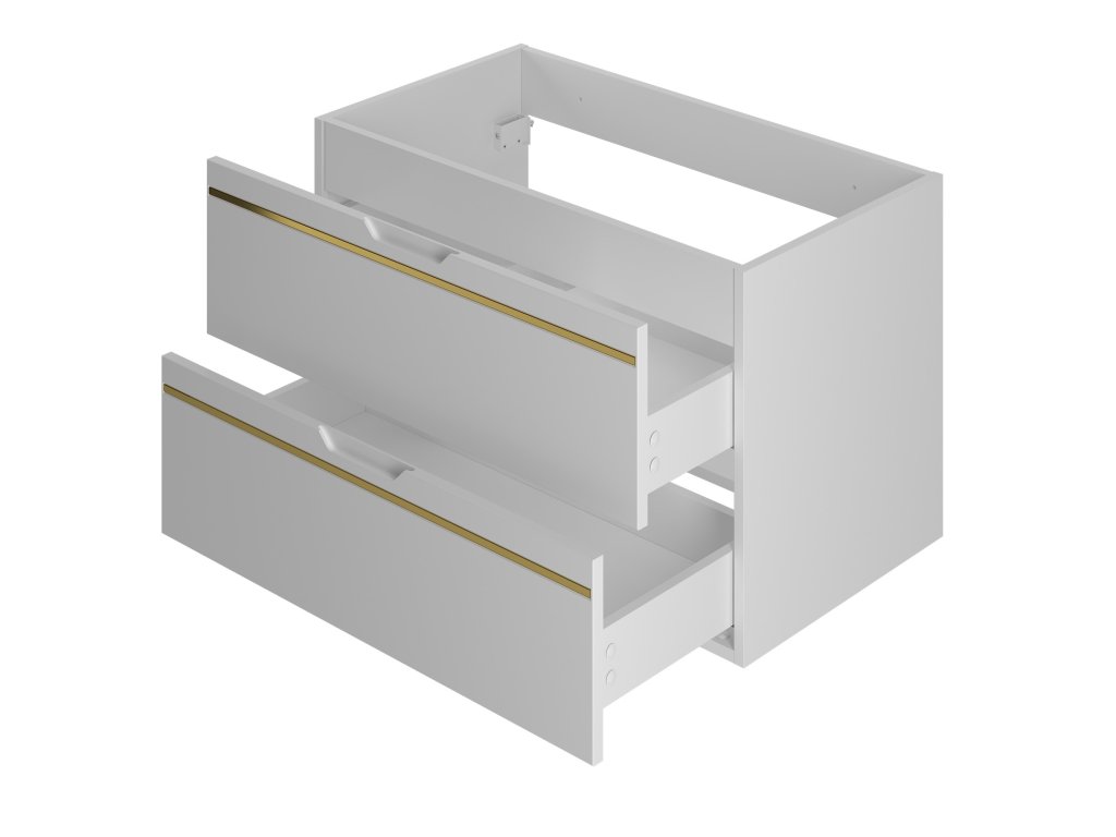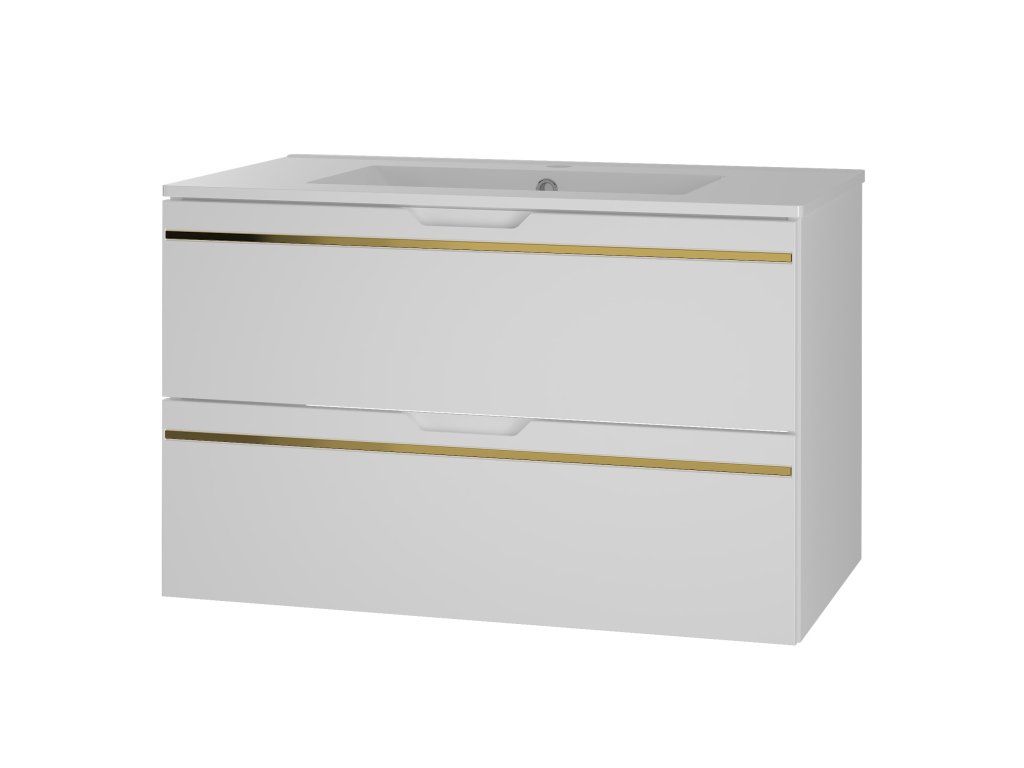 Závěsná koupelnová skříňka s umyvadlem Espero 01 vyniká hladkým bílým matným povrchem se zlatým pasem, který jí dodává elegantní vzhled. Nabízí dvě zásuvky s polovýsuvem a tichým dovíráním, což zaručuje pohodlné a tiché používání. Zásuvky se otevírají pomocí zafrézovaných úchytů, díky čemuž zůstávají linie skříňky čisté a moderní.