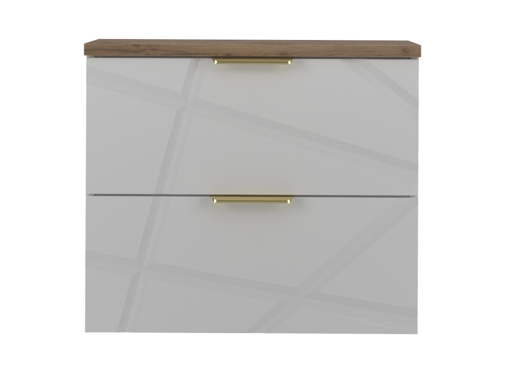 Elegantní bílou matnou skříňku do koupelny doplněnou přírodním tónem dubu wotan z kolekce Radan s unikátními nepravidelnými zářezy na frontách a zlatými kovovými úchytkami, nabízíme ve dvou variantách s vrchní deskou is umyvadlem na desku. Disponuje dvěma zásuvkami vybavenými částečným výsuvem a tichým dovíráním. Vyrobená z kvalitních materiálů zajišťuje trvanlivost a moderní design. Ideální pro stylovou a funkční koupelnu.