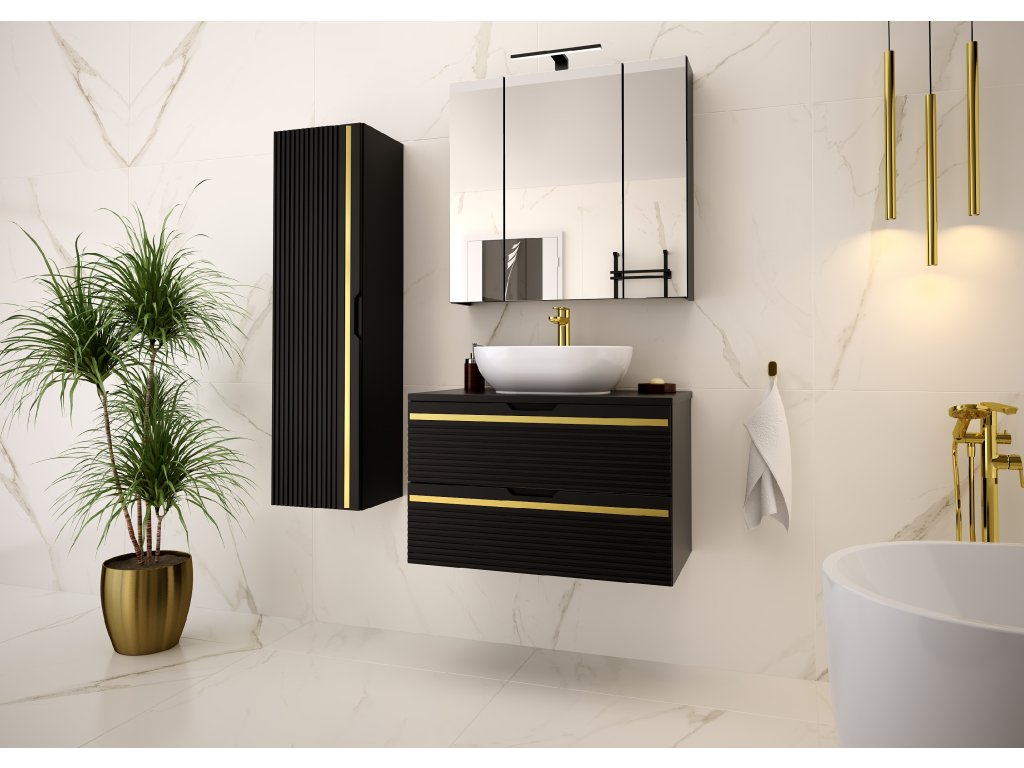 Závěsná koupelnová skříňka s umyvadlem Vesper 01 vyniká černým matným povrchem se zlatým pasem, který jí dodává elegantní vzhled. Nabízí dvě zásuvky s polovýsuvem a tichým dovíráním, což zaručuje pohodlné a tiché používání. Zásuvky se otevírají pomocí zafrézovaných úchytů, díky čemuž zůstávají linie skříňky čisté a moderní.