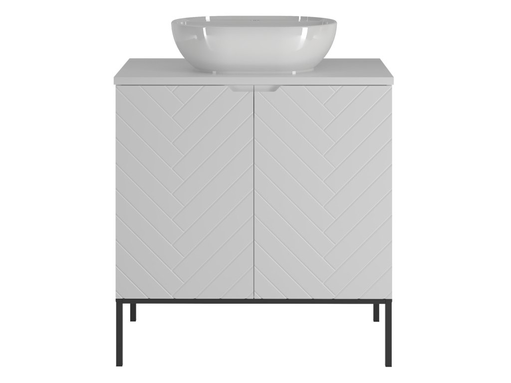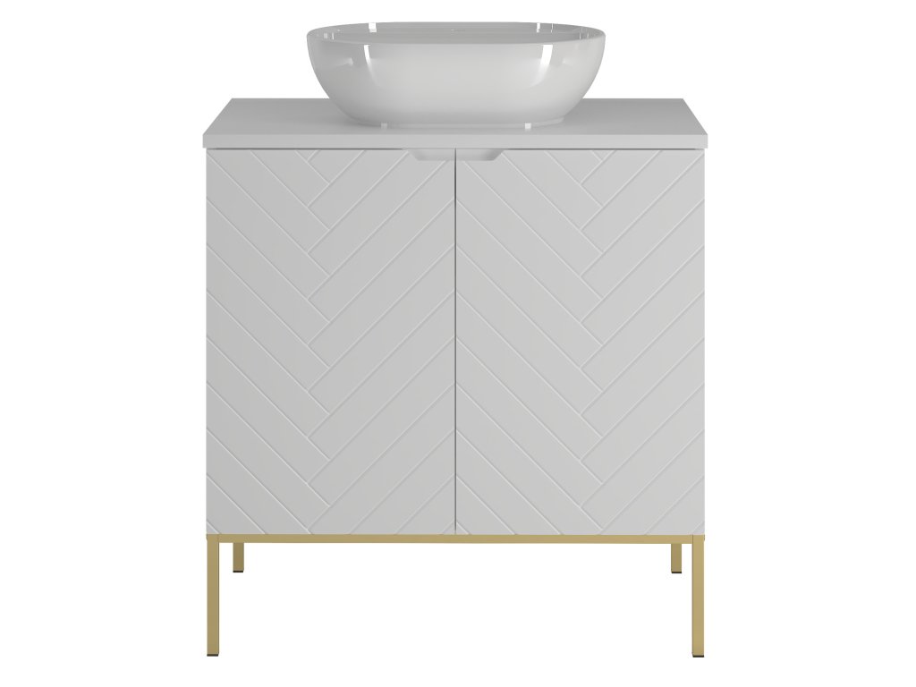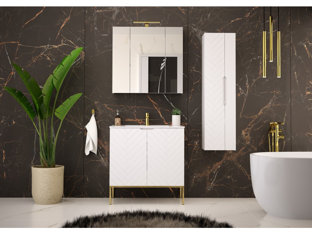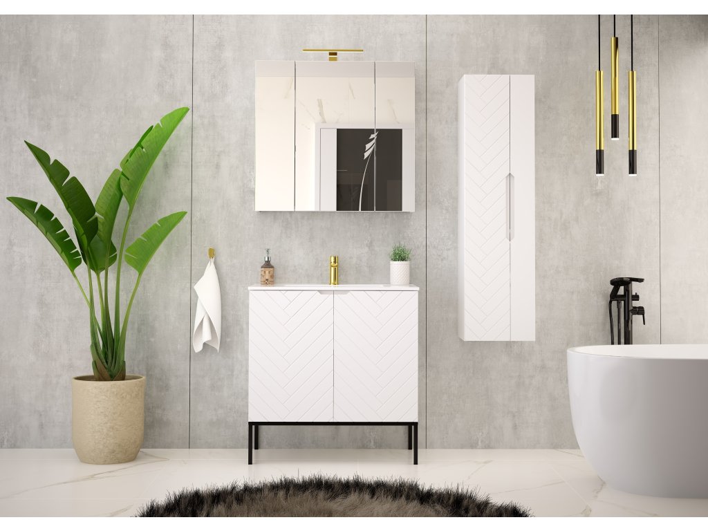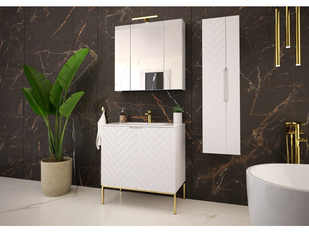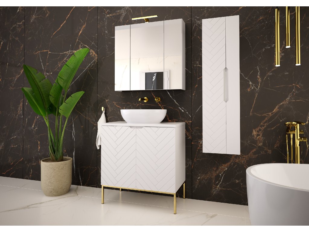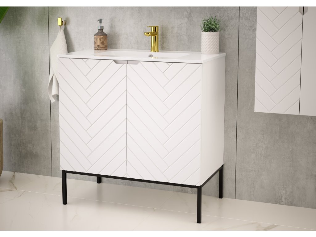 Koupelnová skříňka Aspen 08 v matné bílé barvě nabízí výběr ze čtyř praktických sestav. Dostupná je verze bez vrchní desky, se vrchní deskou, s umyvadlem na desce ve tvaru misky nebo se zápustným umyvadlem. Frézovaná čela se stromečkovým vzorem a minimalistický design zaručují moderní vzhled, který zapadne do každé koupelny. Se šířkou 80 cm a dostatečným úložným prostorem je ideálním spojením stylu a funkčnosti.