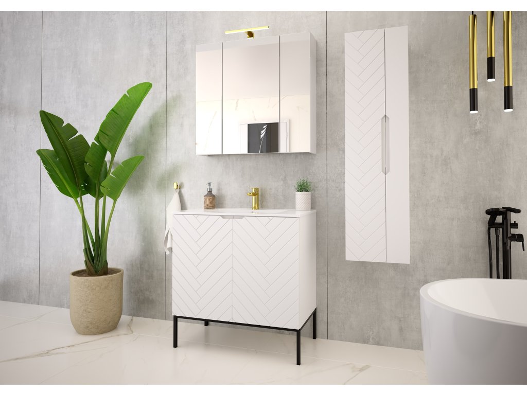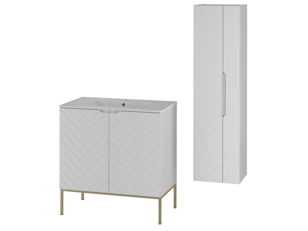 Koupelnová skříňka Aspen 08 z kolekce Aspen nabízí možnost výběru ze čtyř různých sestav, aby dokonale splnila vaše požadavky na design a funkčnost. Každá varianta se vyznačuje moderním frézovaným stromečkovým vzorem na dvířkách a minimalistickým bezúchytkovým designem. Šířka 80 cm a praktické úložné prostory jsou základem každého typu sestavy.