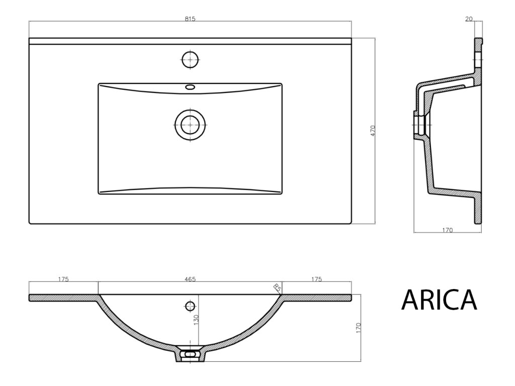 - Umyvadlo Arica (zápustné): rozměry (ŠxHxV) - 81 x 46,5 x 17,5 cm