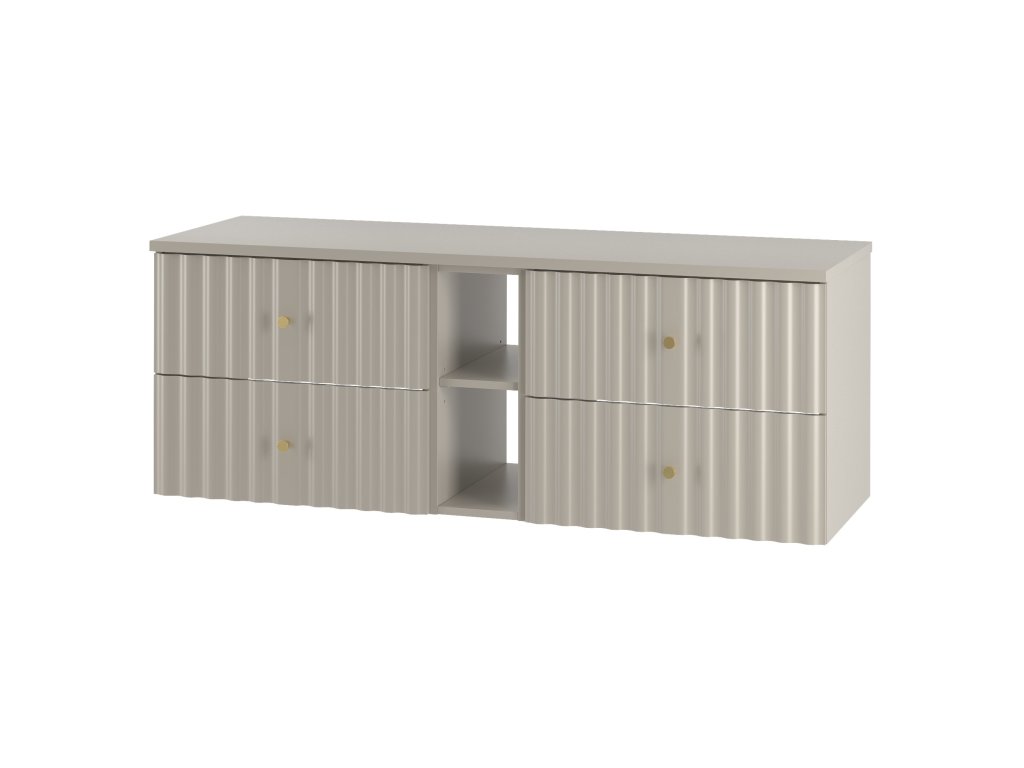 Široká skříňka pod umyvadlo Aqua 02 140 v matné béžové barvě je dokonalou kombinací funkčnosti a elegance. Vytvořená spojením dvou skříněk 60 cm s celistvou deskou 140 cm, nabízí čtyři zásuvky a navíc otevřenou poličku. Vlnovitý profil dvířek a zlaté úchyty ve tvaru kuliček dodávají skříňce luxusní a moderní vzhled, který oživí každou koupelnu.