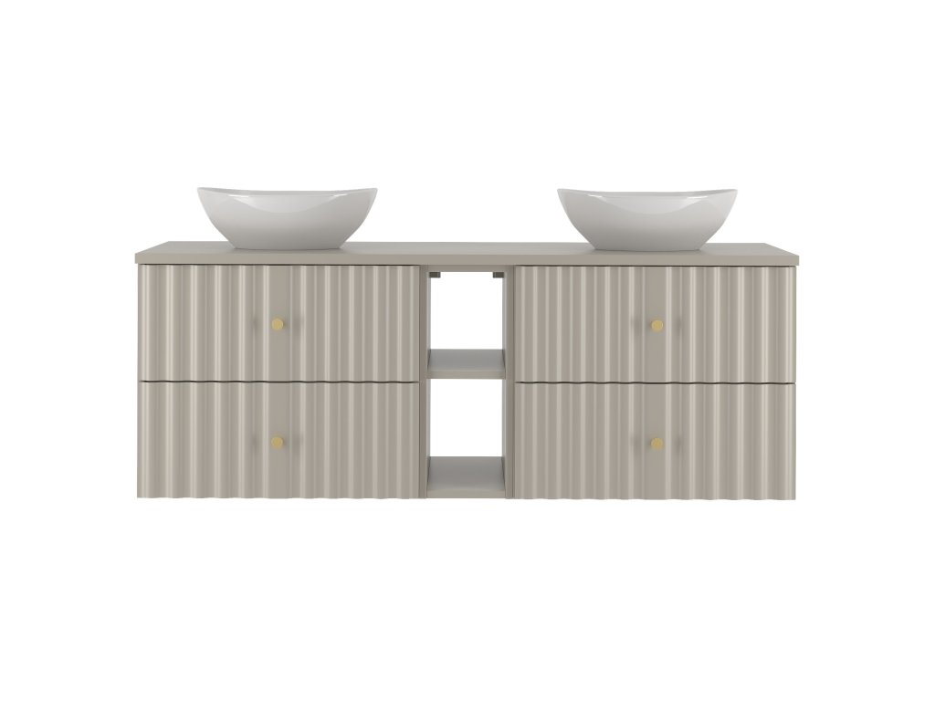 Koupelnová skříňka Aqua 02 140 v matné béžové barvě přináší jemný, ale moderní design s dvojnásobnou praktičností. Tento produkt je vytvořen spojením dvou skříněk o šířce 60 cm a poličky o šířce 20 cm, přičemž vrchní deska je celistvá a má šířku 140 cm. Disponuje čtyřmi zásuvkami a je dostupná ve variantách: s vrchní deskou, nebo s dvěma umyvadly na desku.