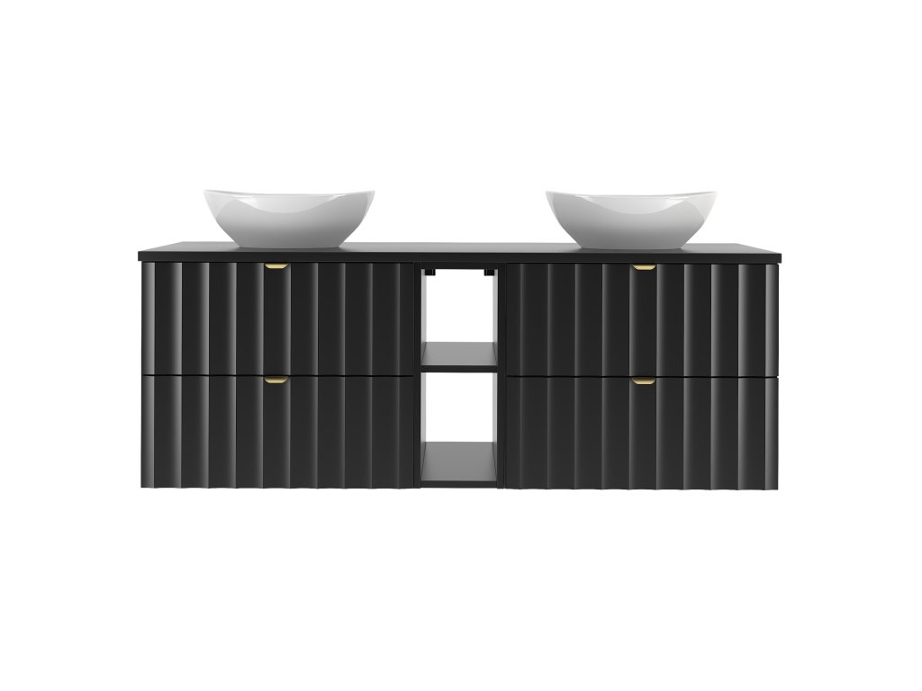 Široká koupelnová skříňka Arkos 06 140 v matné černé barvě nabízí sofistikovaný design a praktické řešení. S šířkou 140 cm, úzkou poličkou a dvěma variantami – s vrchní deskou nebo s umyvadly na desku – se dokonale přizpůsobí modernímu interiéru. Profil vtlačených vln a zlaté kovové úchyty dodávají prostoru luxusní vzhled, zatímco závěsné provedení zajišťuje vzdušnost a styl.