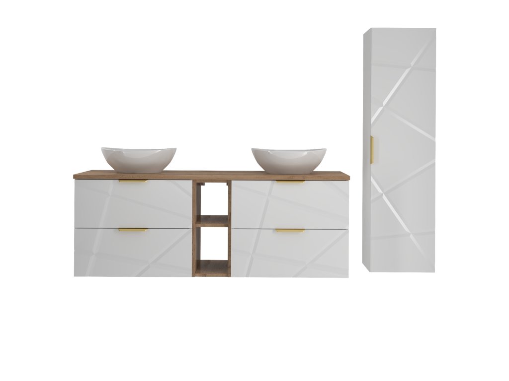 Je vybavena zlatými kovovými úchyty, které přidávají luxusní nádech. Skříňka do koupelny je dostupná ve dvou variantách: s deskou a umyvadly na desku.