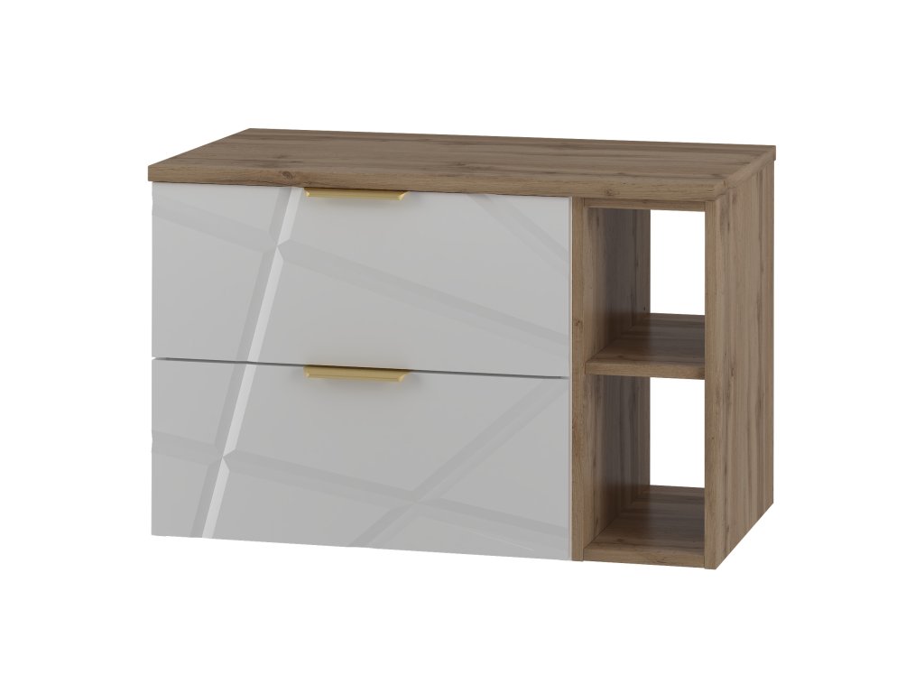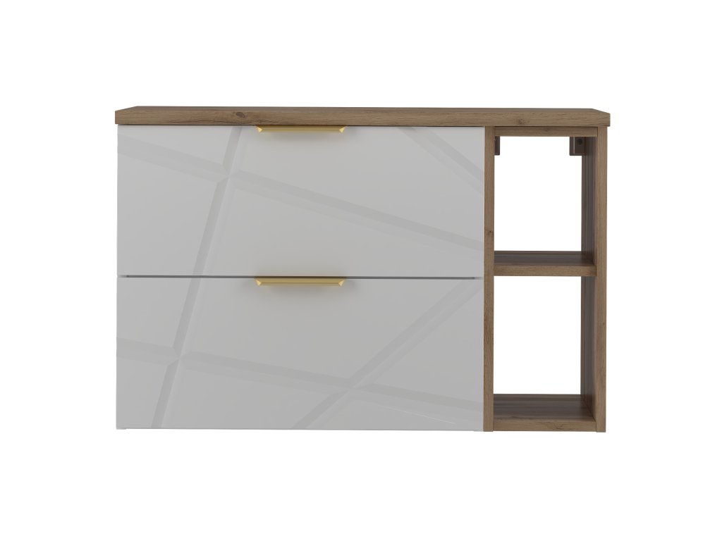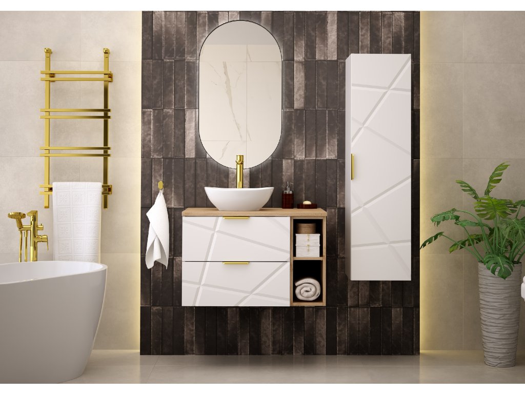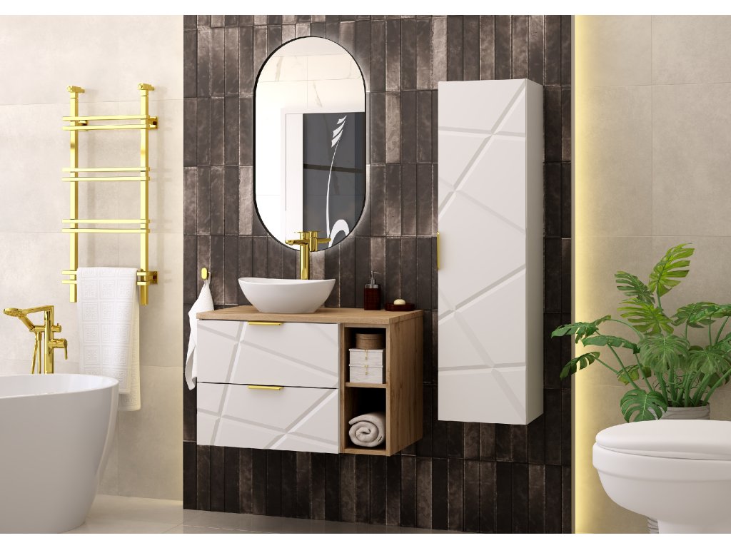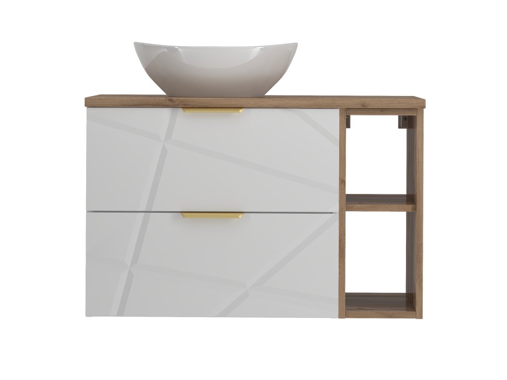 Stavte na stylovou skříňku pod umyvadlo s poličkou Radan 07P v bílé barvě doplněnou přírodním tónem dubu wotan z kolekce Radan s unikátními nepravidelnými zářezy na frontách a zlatými kovovými úchyty, kterou nabízíme ve dvou variantách s vrchní deskou is umyvadlem na desku. Disponuje dvěma zásuvkami vybavenými částečným výsuvem a tichým dovíráním. Vyrobená z kvalitních materiálů zajišťuje trvanlivost a moderní design.