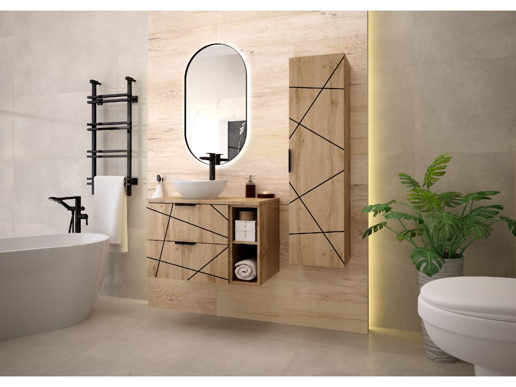 Kolekce Westy přináší sofistikovaný a funkční design, který zosobňuje model skříňky pod umyvadlo s poličkou Westy 02P. Tato 80 cm široká skříňka se dvěma zásuvkami je navržena s důrazem na přehlednost a praktičnost, přičemž její úprava dubu wotan v kontrastu s výraznými černými úchyty a pásy dodává jedinečný moderní charakter.