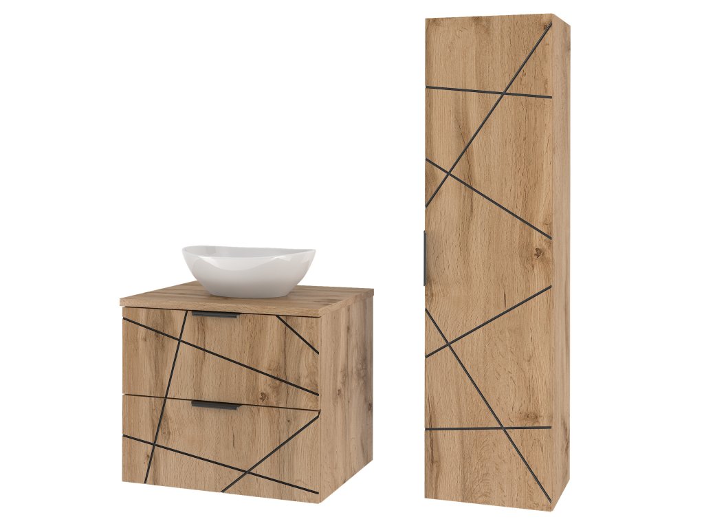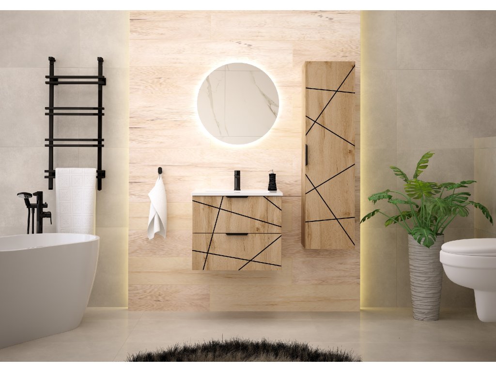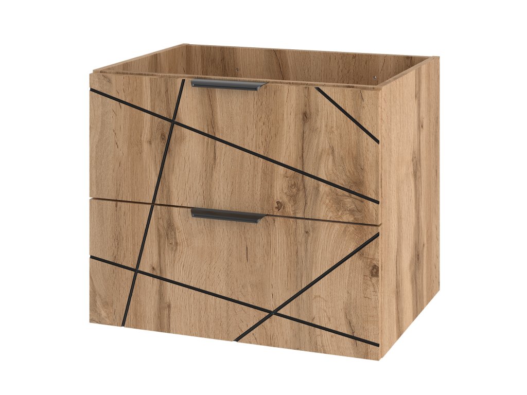 Kolekce Westy přináší sofistikovaný a funkční design, který zosobňuje model skříňky pod umyvadlo Westy 02. Tato 60 cm široká skříňka se dvěma zásuvkami je navržena s důrazem na přehlednost a praktičnost, přičemž její úprava v dekoru dub wotan v kontrastu s výraznými černými úchyty a pásy dodává jedinečný moderní charakter.