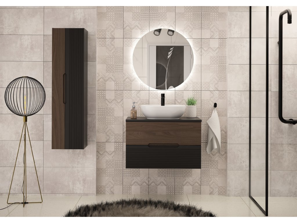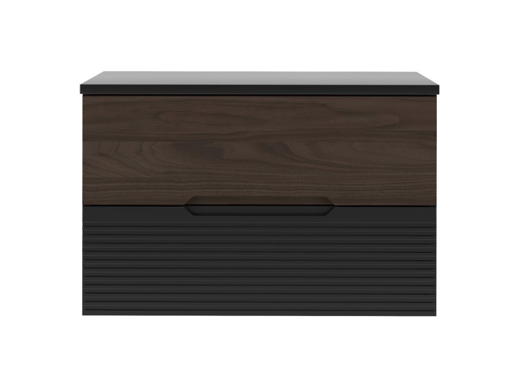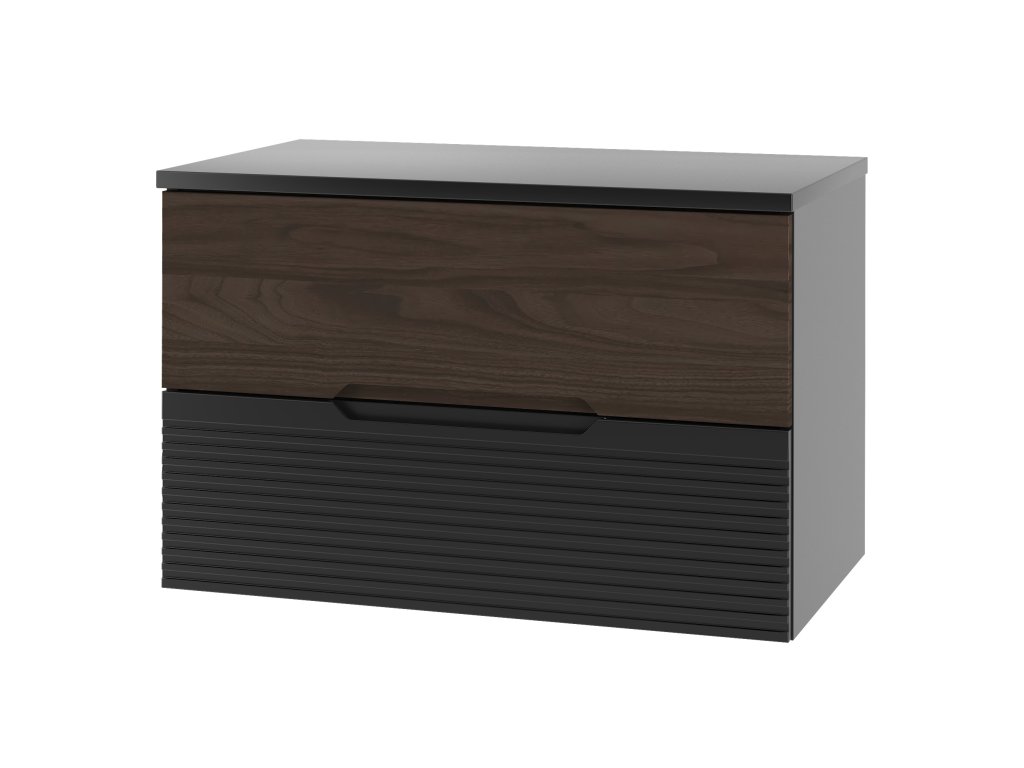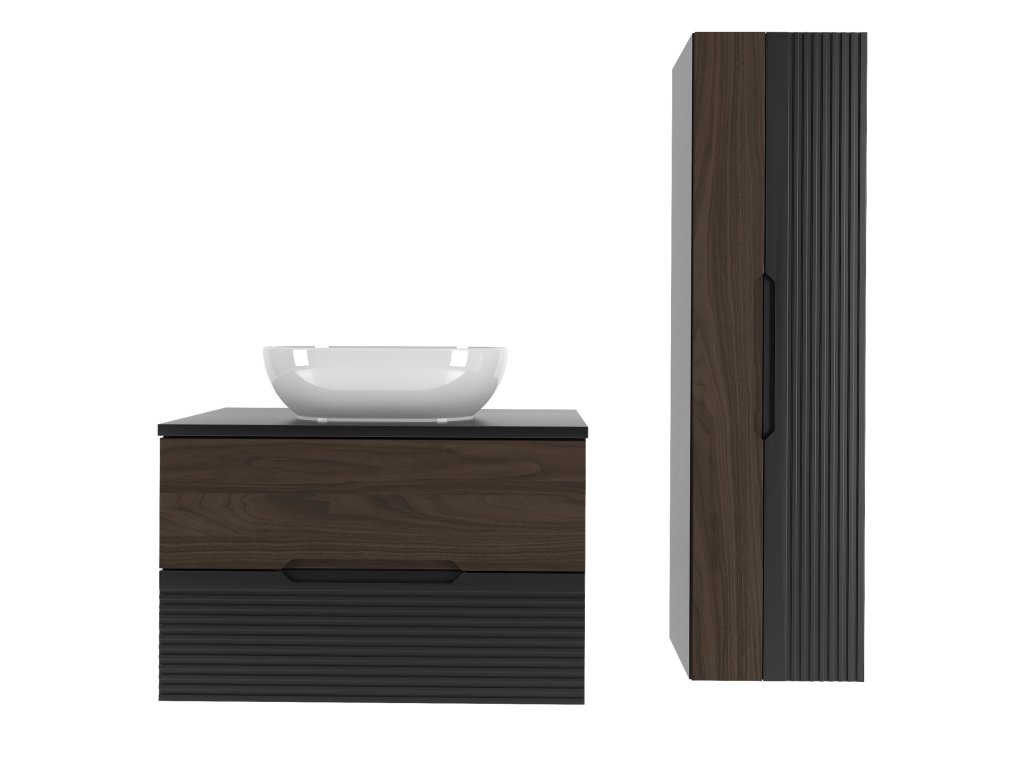 Koupelnová skříňka Avela 01 se šířkou 80 cm spojuje elegantní ořechový dekor na horním zásuvce s matnou černou a vodorovnými zářezy na spodním zásuvce. Design bez úchytek, dostupnost ve čtyřech variantách – bez desky, s deskou, s umyvadlem na desku nebo zápustným umyvadlem – a závěsné provedení dělají z této skříňky praktickou a stylovou.