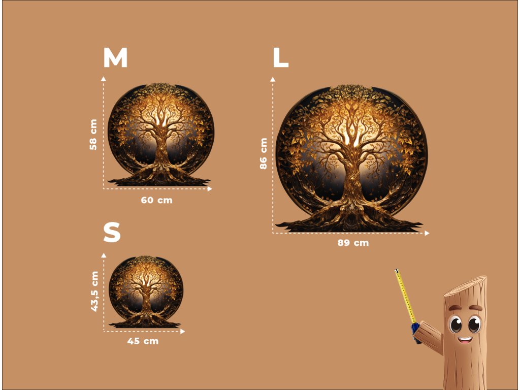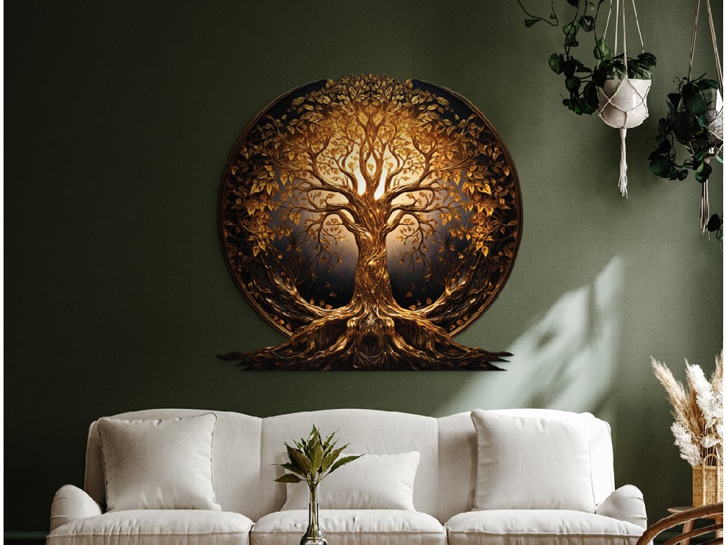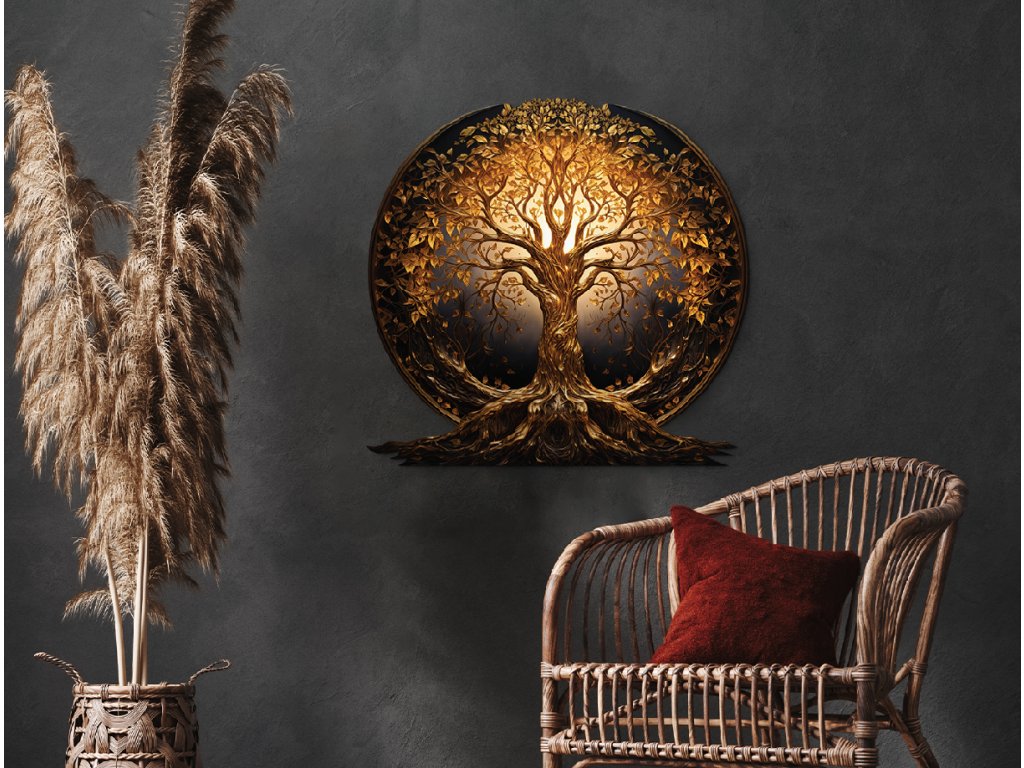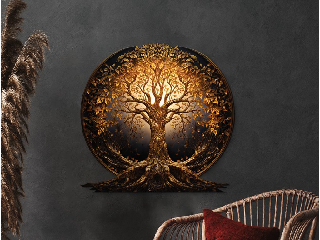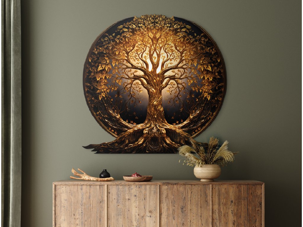 Elegantní kulatá dekorace zobrazuje zlatý Strom života s bohatě rozvětvenými kořeny a korunami listů, které září jemnými zlatým barvami. Kompozice působí harmonicky a vyváženě, přičemž zdůrazňuje symboliku životní síly, růstu a spojení mezi nebem a zemí.