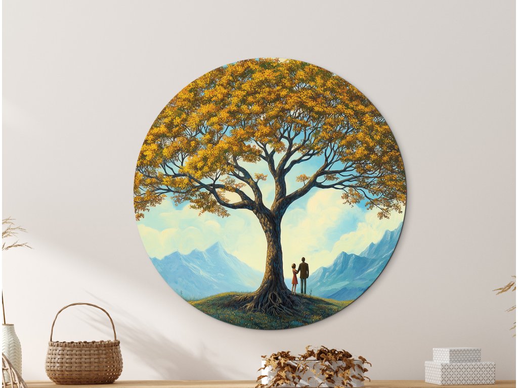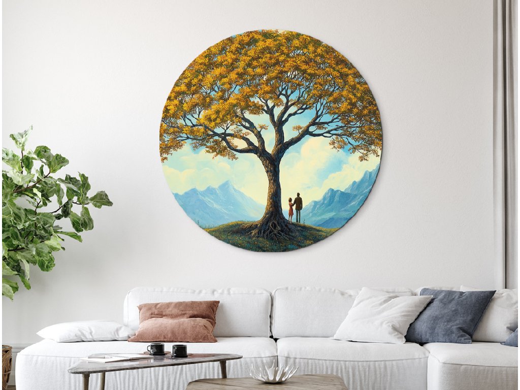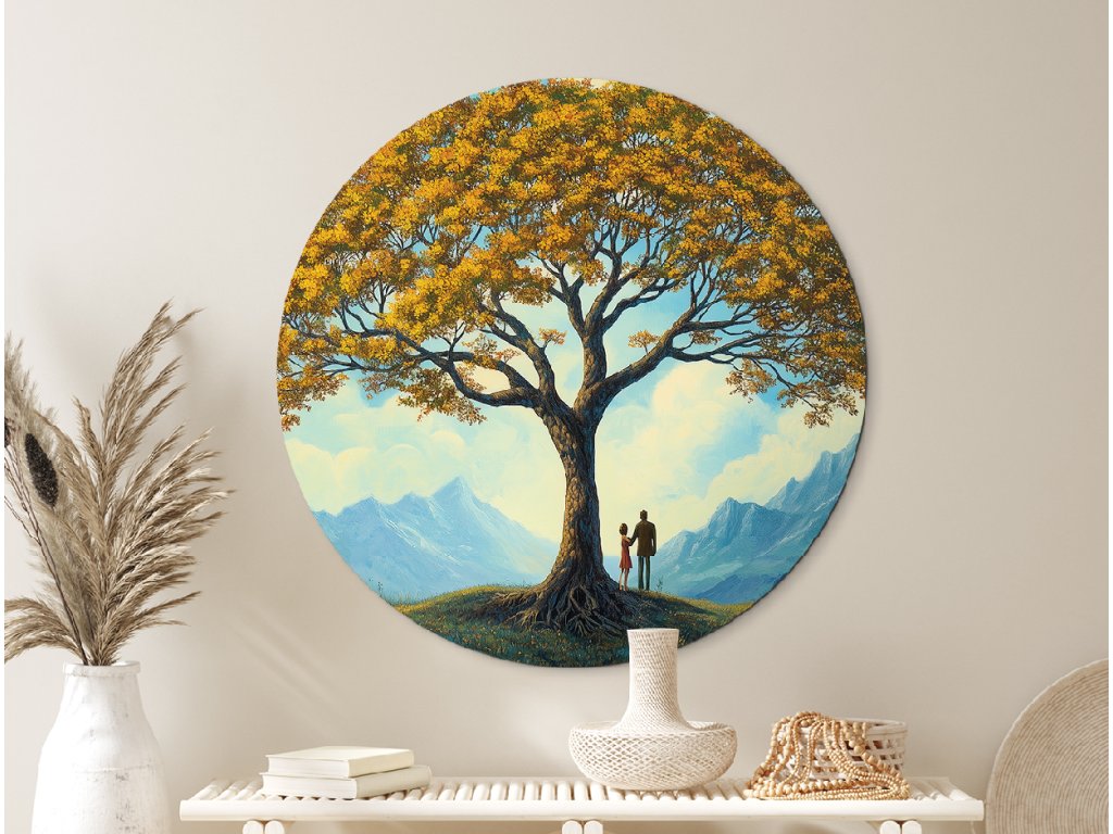 Rozlehlý zlatý strom s viditelnými kořeny stojí v centru kruhové kompozice, symbolizující stabilitu a propojení generací. Dvě postavy směřují pohled k modrým horám pod jemnou oblohou, což navozuje pocit naděje a kontinuity. Kulatý formát obrazu podtrhuje cykličnost života a jednotu člověka s přírodou.