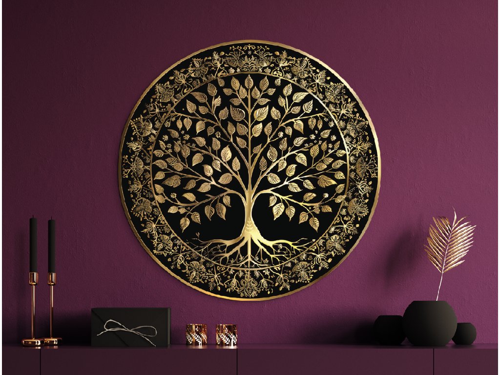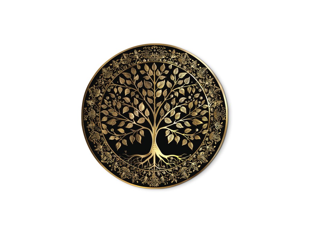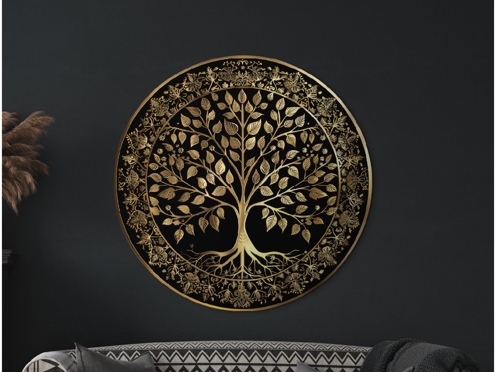 Elegantní kruhová dekorace s motivem Stromu života ve zlaté barvě na černém pozadí. Strom s bohatou korunou a rozvětvenými kořeny je obklopen ornamentálním okrajem s květinovými vzory, což dodává dílu luxusní a symbolický vzhled. Ideální jako výrazný prvek do moderního i klasického interiéru.