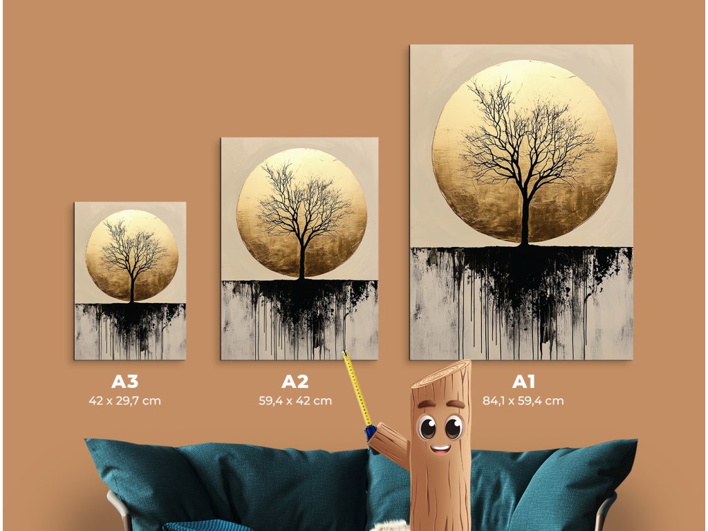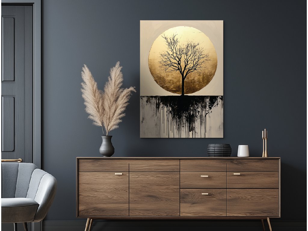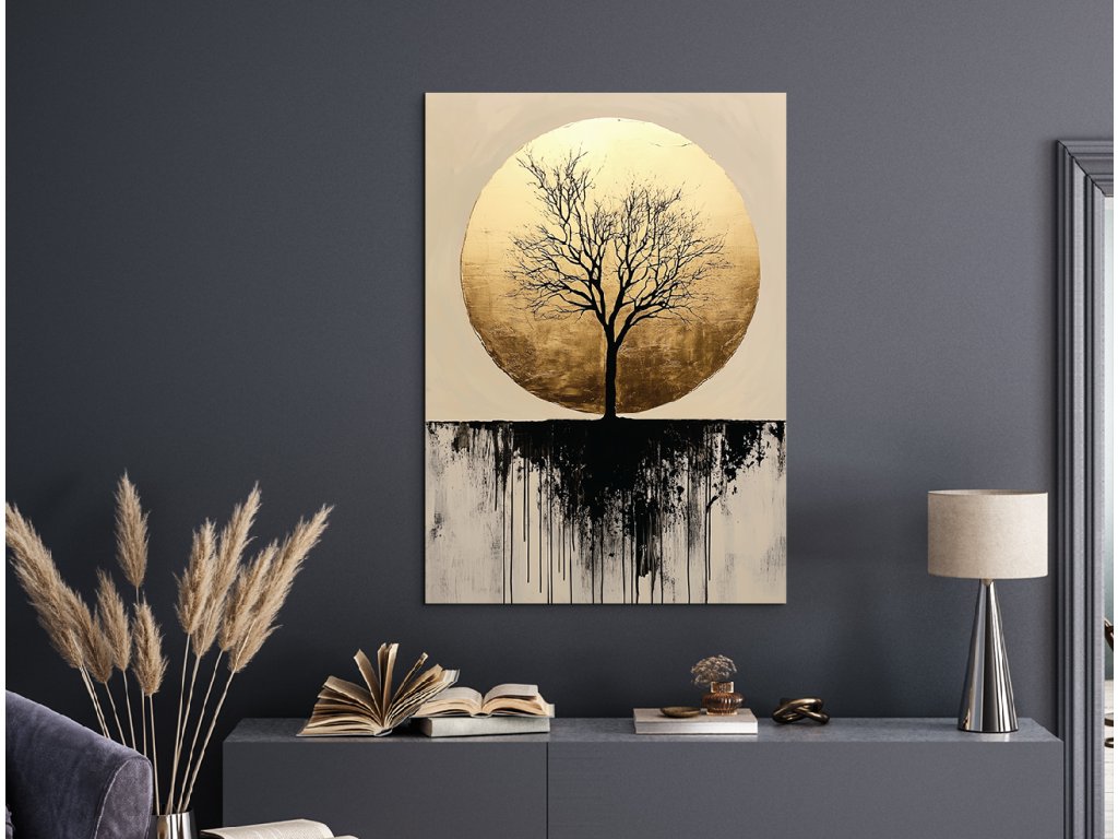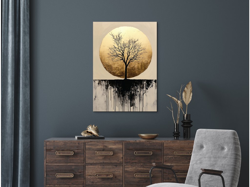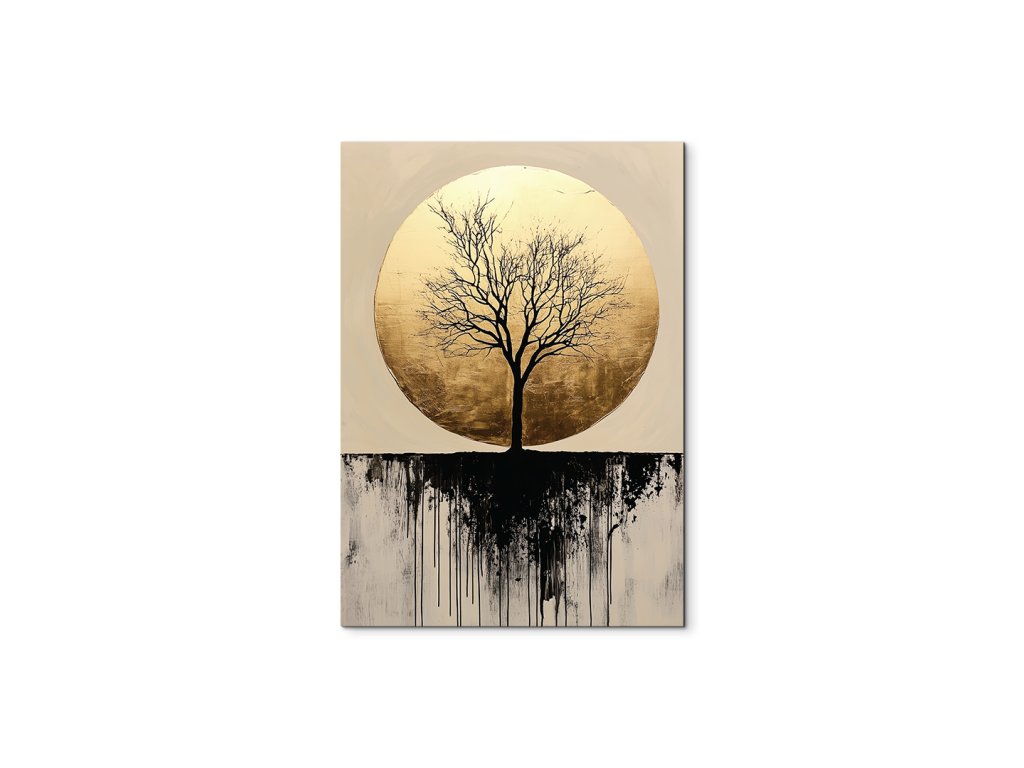 Strom života Zlaté ticho je holý strom před zlatým kruhem připomínající spojení světla a energie se symbolikou života a rovnováhy. Stékající černo-bílá textura ve spodní části působí jako odraz nebo kořeny, které zanikají v hloubce. Tento obraz přinese klid a symbolickou hloubku do každého moderního prostoru.