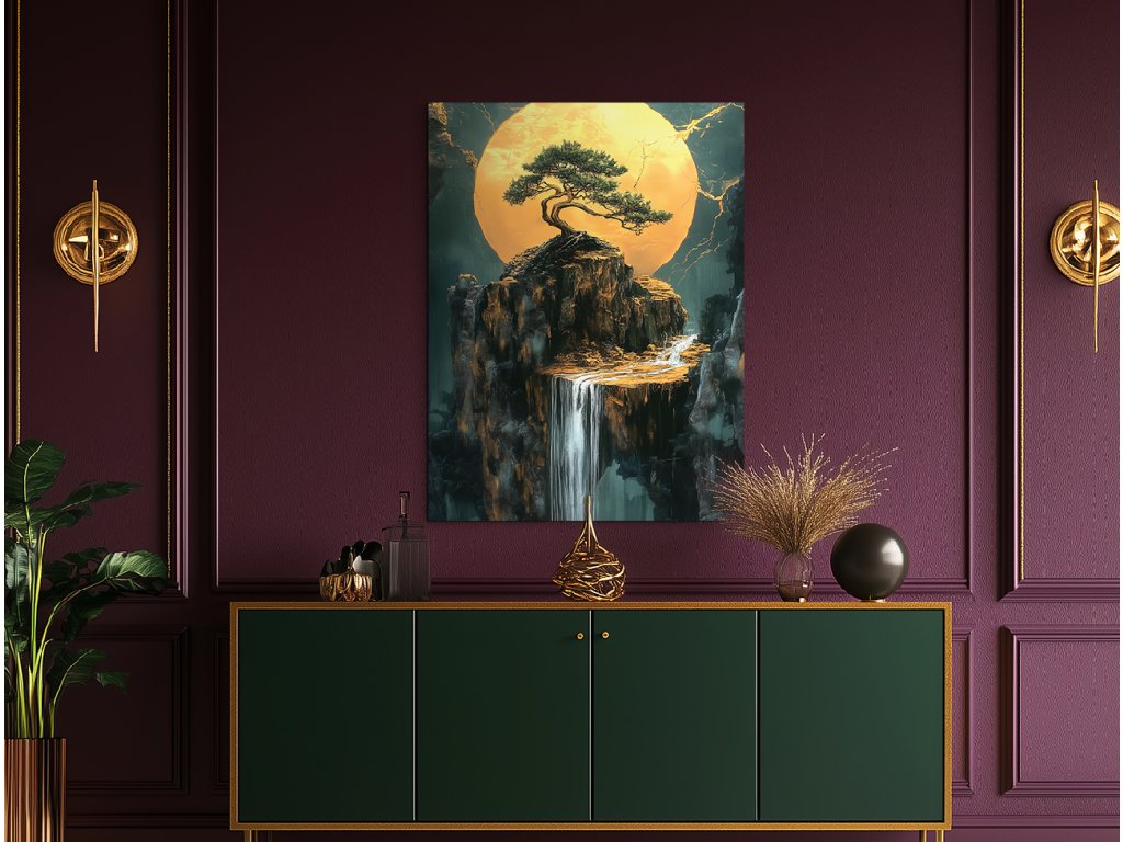 Bonsajový strom na útesu symbolizuje rovnováhu a vytrvalost v kontrastu s otevřenou krajinou. Zářivé slunce nebo měsíc ve zlatých tónech osvětluje vodopád a skalní masiv pod ním. Zlaté praskliny v pozadí dodávají obrazu dramatický a umělecký výraz s nádechem mystiky.