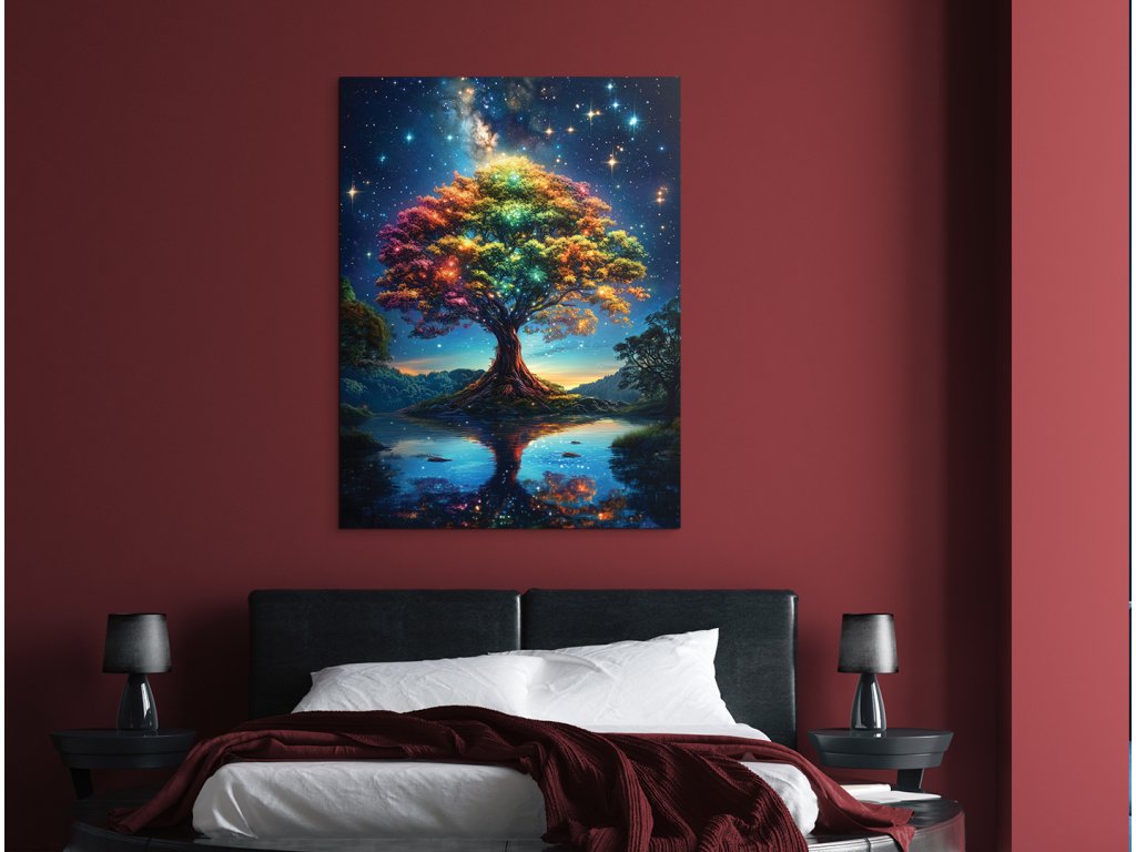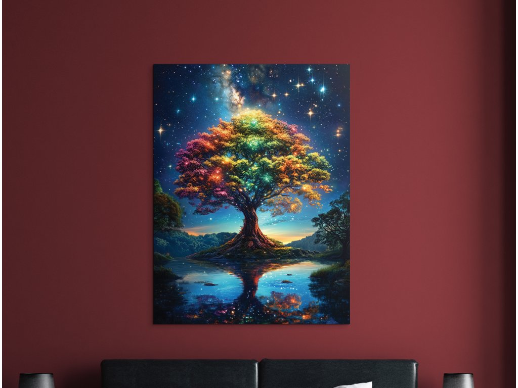 Barevný strom života na pozadí hvězdné oblohy působí jako most mezi vesmírem a zemí. Jeho silueta se zrcadlí ve vodní hladině, čímž vzniká klidná a snová kompozice. Obraz přináší do prostoru inspiraci, ticho a duchovní rozměr.