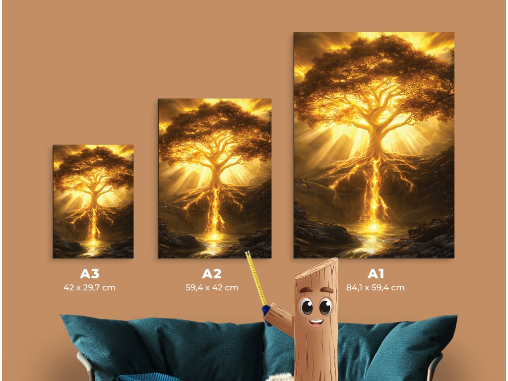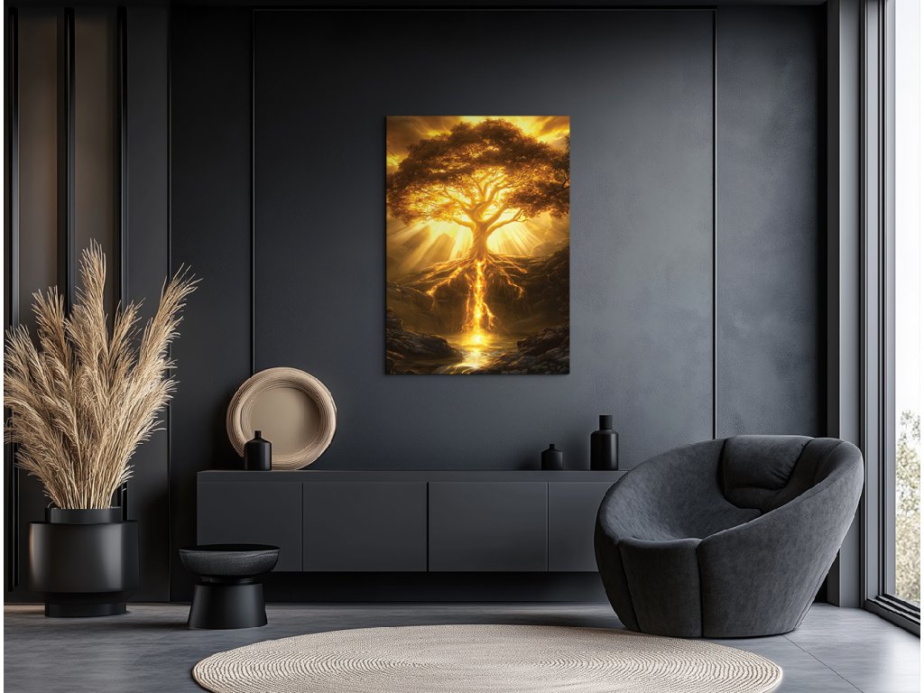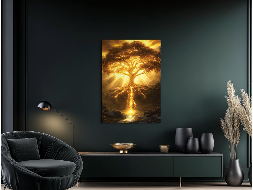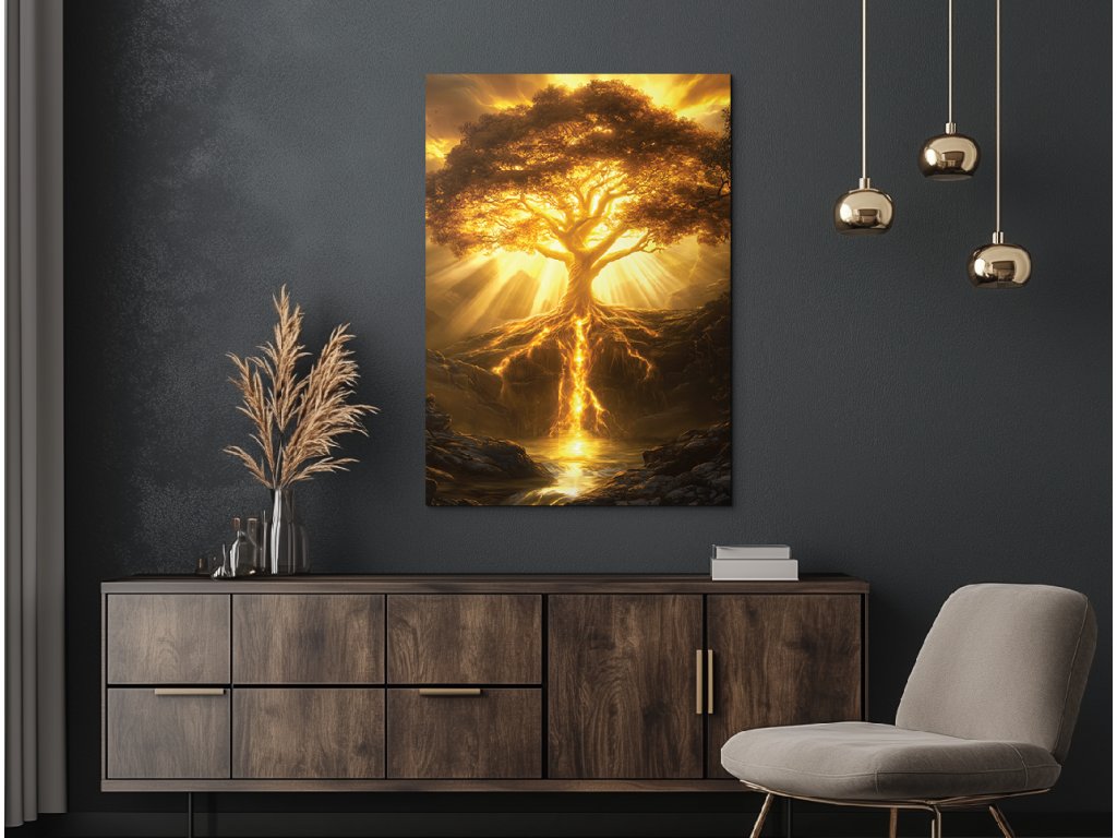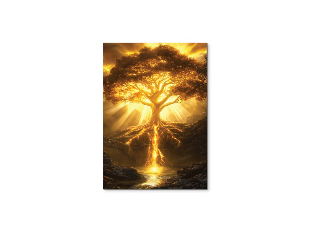 Zlatavé kořeny stromu života se přeměňují na světelný tok vody, který proudí skalnatou krajinou. Koruna září světlem, které vytváří mystickou a éterickou atmosféru. Obraz působí jako symbol síly, propojení a energie, ideální do klidného nebo meditačního prostoru.
