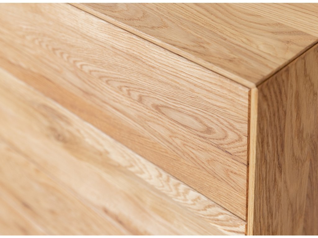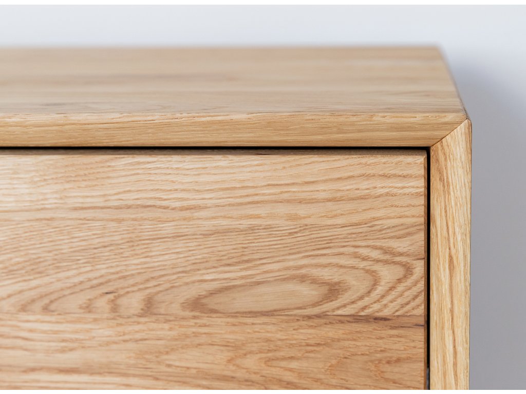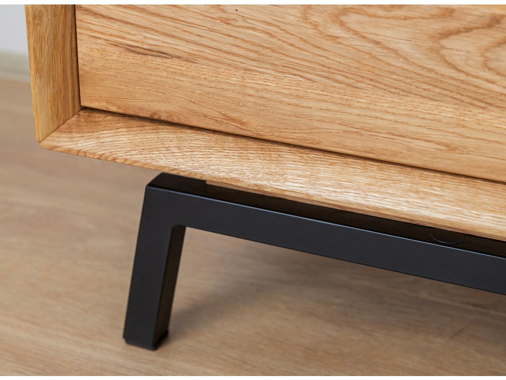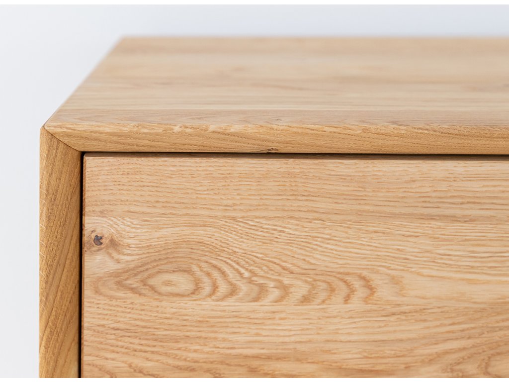 TV stolek je vyroben z dubového dřeva, odolného vůči poškození a zničení. Na povrchu můžete pozorovat viditelné nepravidelné čáry a boule, které se přirozeně ve dřevě vyskytují. Tyto charakteristické linie jsou zdůrazněny v procesu olejování.