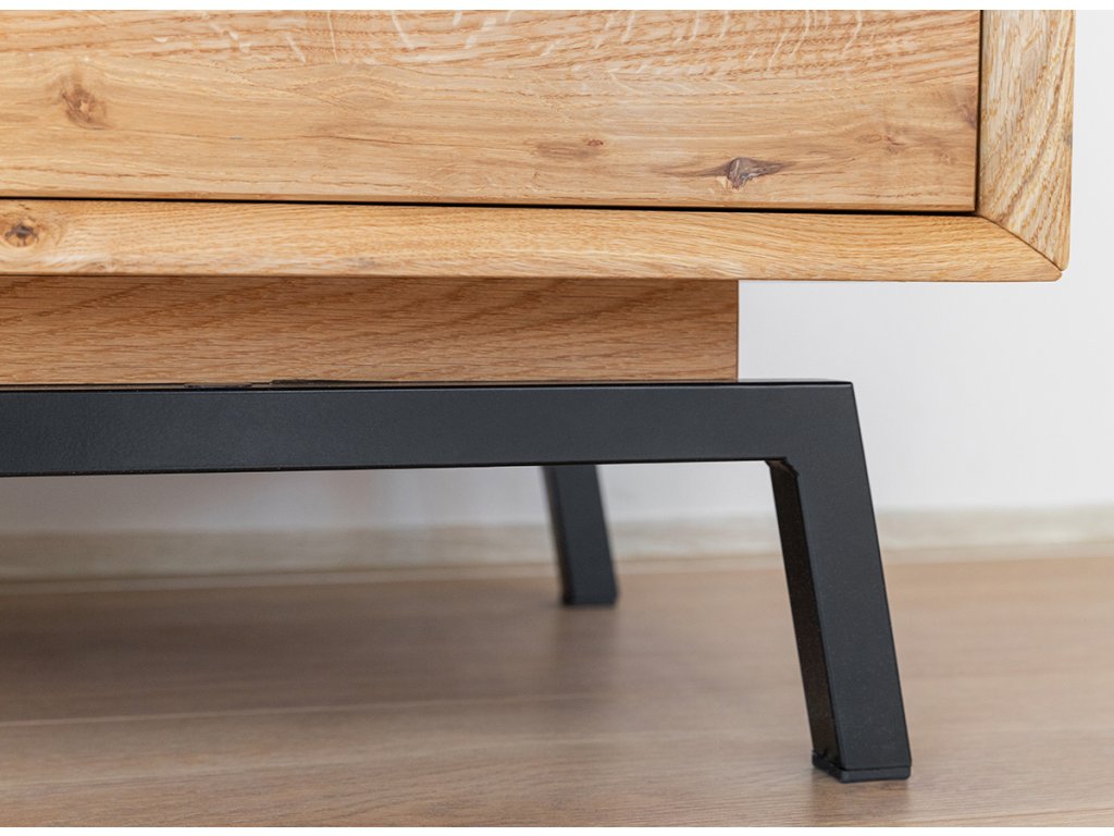 Televizní stolek z dubového dřeva Moft I - 200 cm zazáří v moderním obývacím pokoji. Je vyroben z dubového dřeva v minimalistickém designu. Stojí na kovovém podstavci, který celému stolku dodává loftový vzhled.