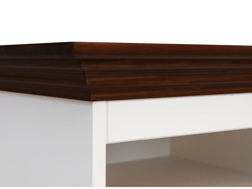 Vzhledem k tomu, že barva je univerzální bílá, bude skvěle vypadat i s dalším nábytkem. Bělost byla získána barvou na vodní bázi s krycí schopností 85%. Stolek má zesílenou, stylizovanou vrchní část, pod kterou jsou dvě otevřené police pro přehrávače nebo CD. Zadní strana komody je vybavena otvory, díky kterým bude mnohem snazší organizovat kabely ze zařízení. Spodní část nábytku tvoří dvě zásuvky na lištách Quadro, které jsou vybaveny tzv. systémem tichého zavírání.