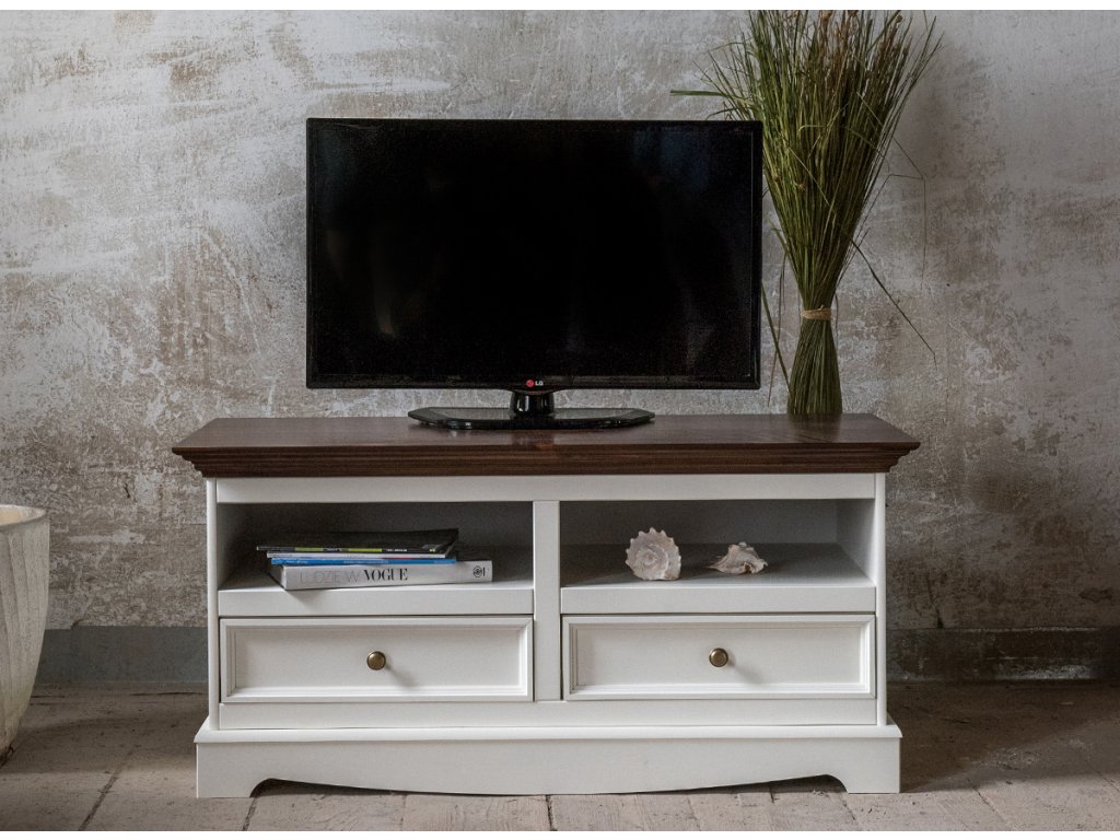 Klasický a mimořádně elegantní bílý TV stolek poskytne nejen prostor pro televizi, ale ozdobí také mnoho interiérů v provensálském stylu. Má 2 zásuvky na drobnosti a 2 otevřené police pro televizní zařízení. Je vyroben z borovicového dřeva.