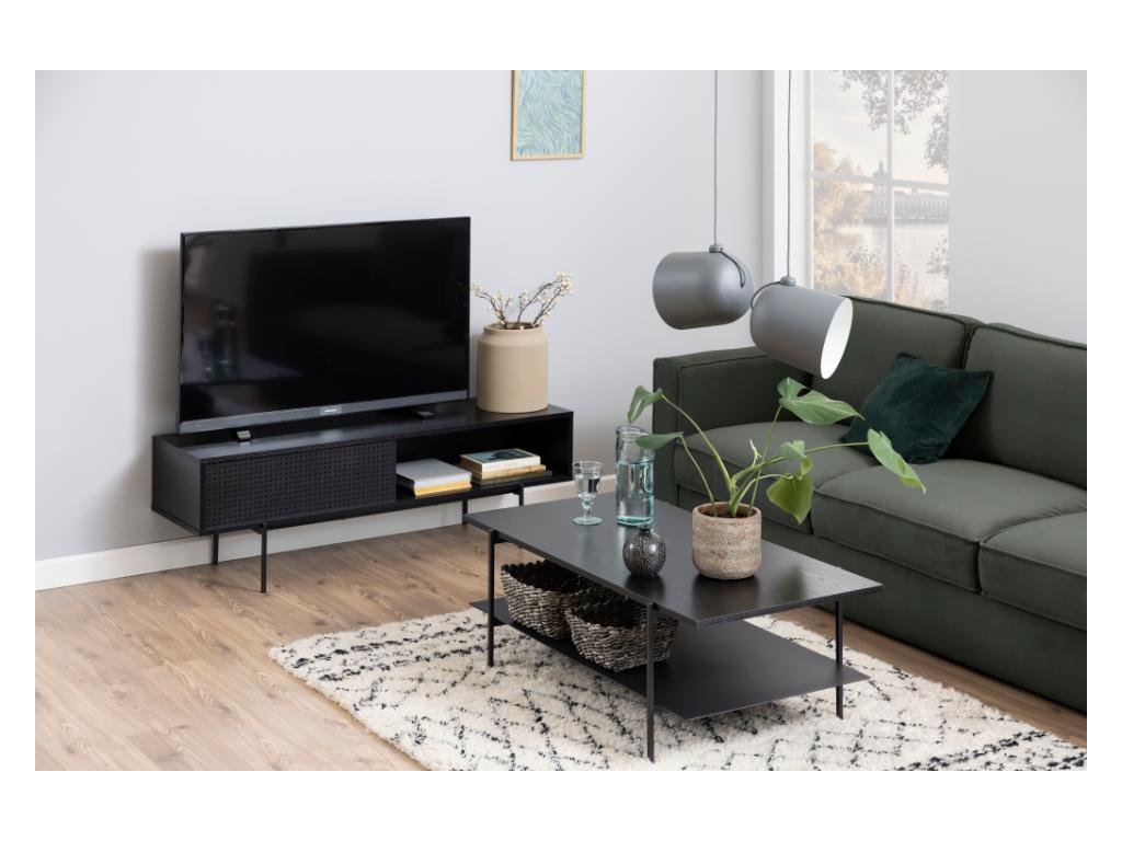 TV skříňka Angus kombinuje praktičnost a industriální styl. Obsahuje otevřené přihrádky, kovovou síťovinu a posuvné dveře, které zvyšují variabilitu úložného prostoru. Vhodná pro moderní interiéry s důrazem na detail. Černá povrchová úprava je nenáročná na údržbu.